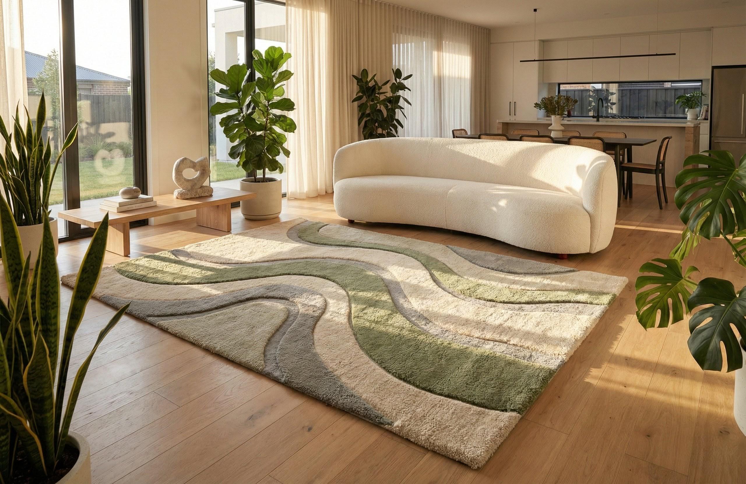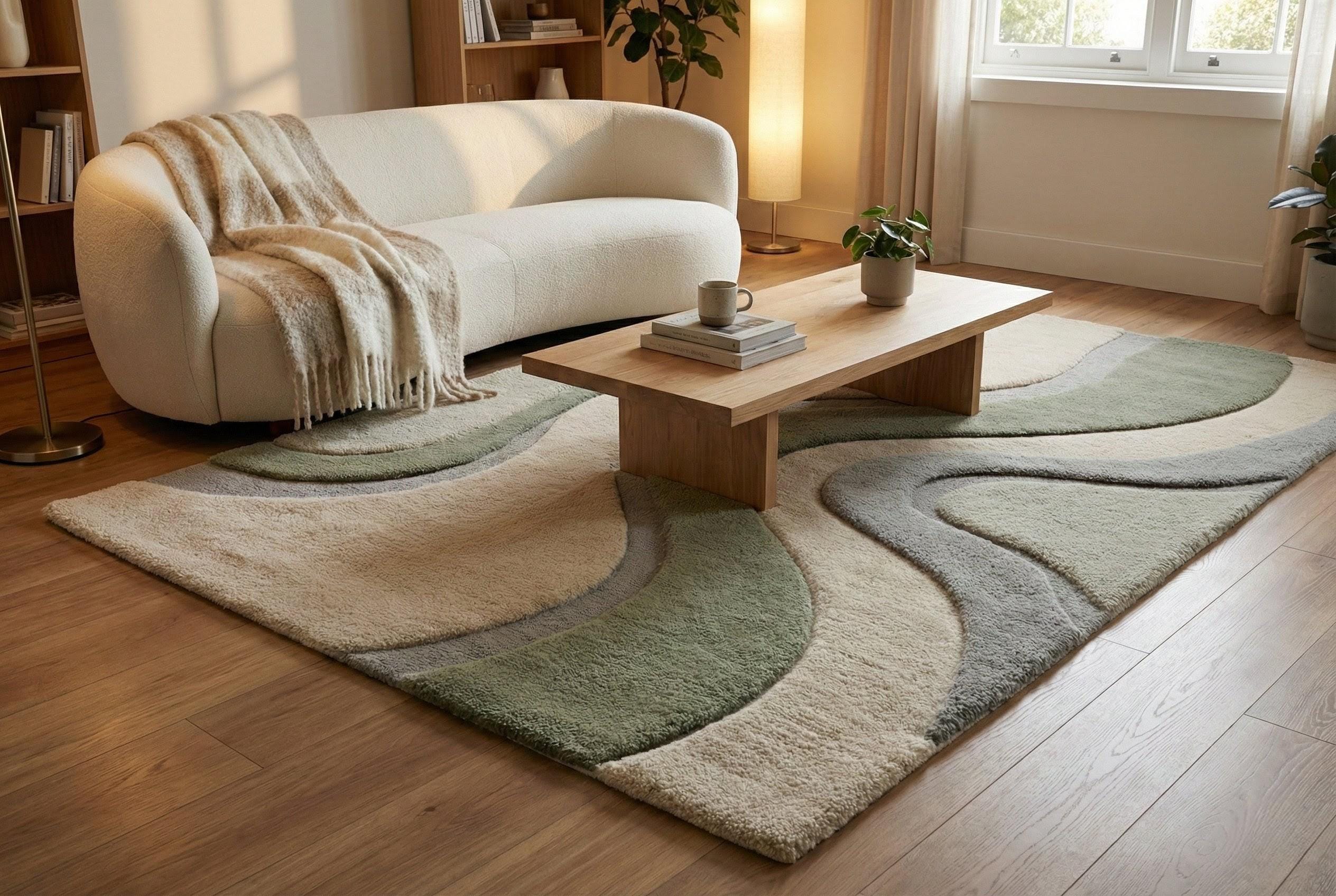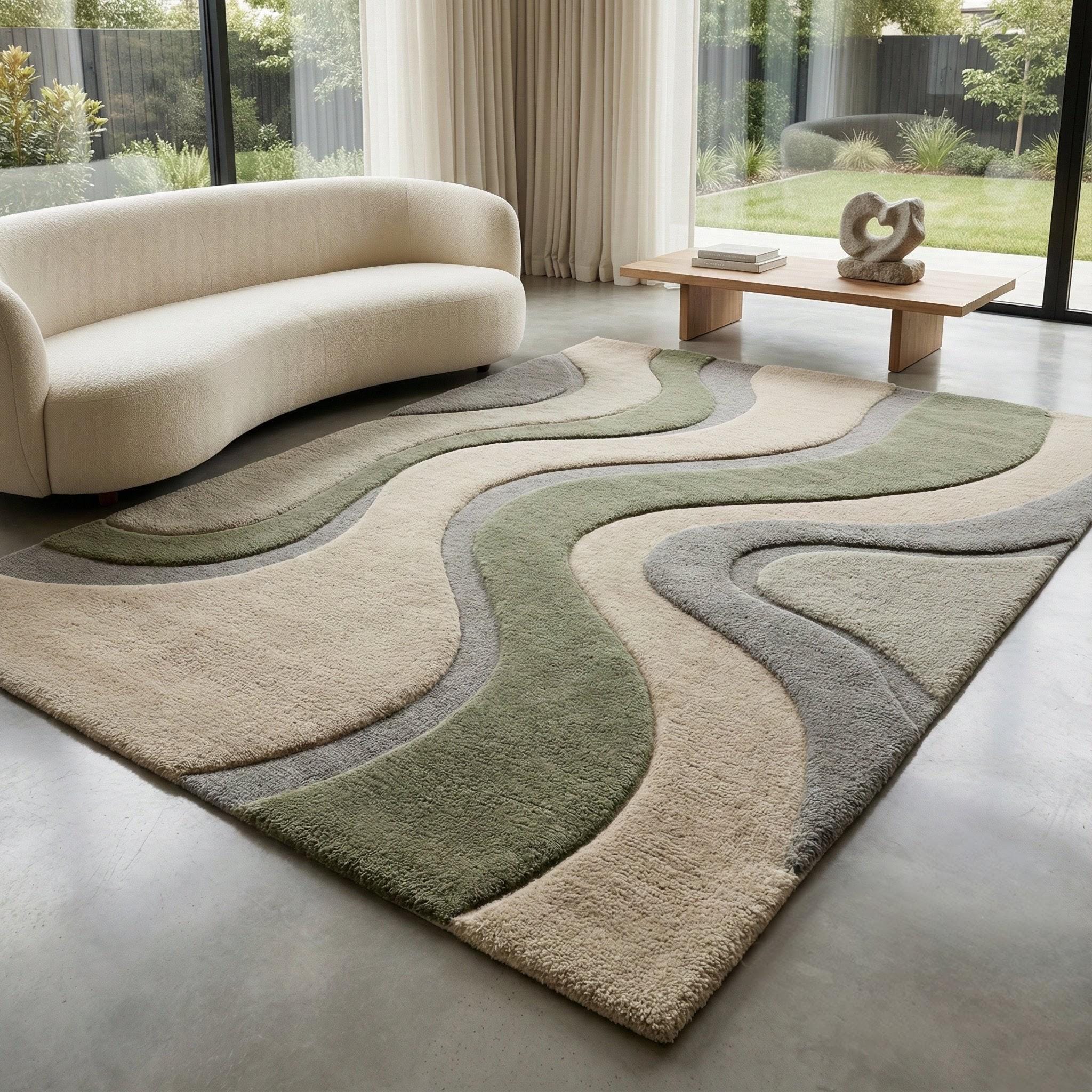 Modern Abstract Wool Area Rug Hand Tufted Sage Green Neutral Wavy Design Plush Cozy Decor Living Room 8x10 9x12 Custom Size MadeToOrder Rug!