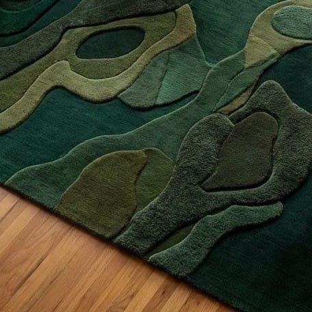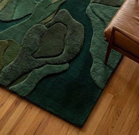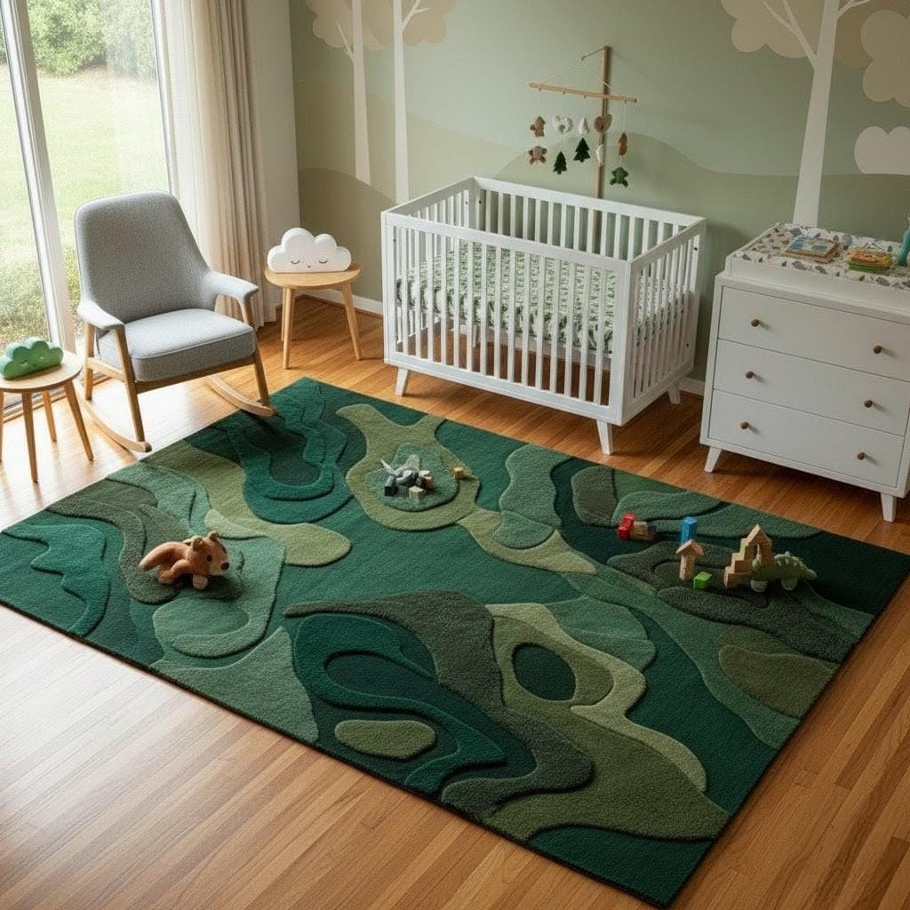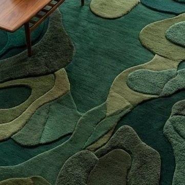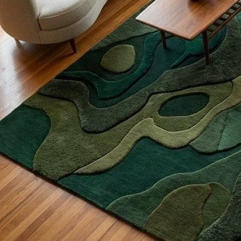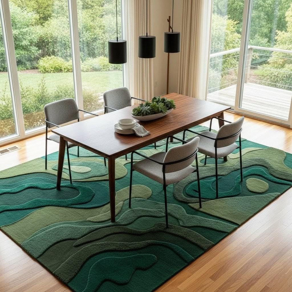 The color palette blends deep emerald, forest green, sage, moss, and soft olive tones — a harmonious gradient that feels grounding yet elevated. The sculpted high-low pattern mimics rolling hills and winding rivers, bringing motion and tranquility into your space.