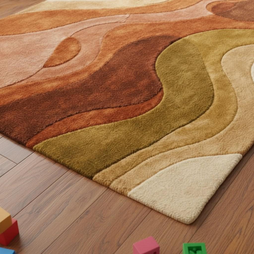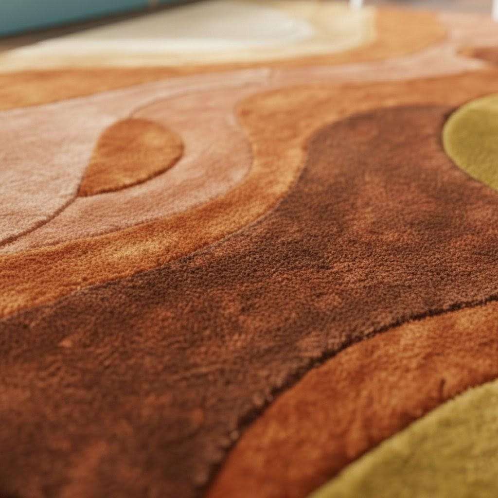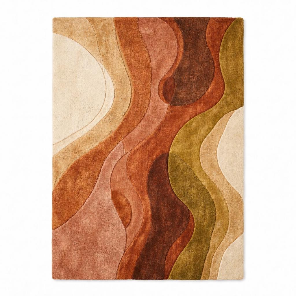 This rug is a masterful celebration of mid-century modern artistry—a flowing composition of organic curves and earthy tones that feel both nostalgic and contemporary. The design features layered waves in burnt rust, terracotta, caramel, olive green, and warm cream, creating a harmonious movement across the surface.