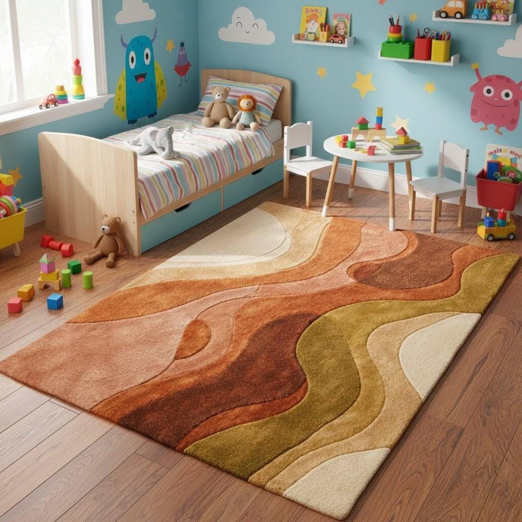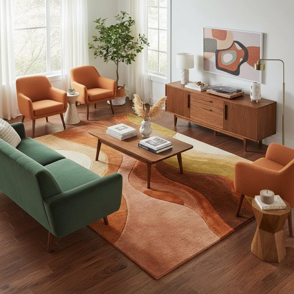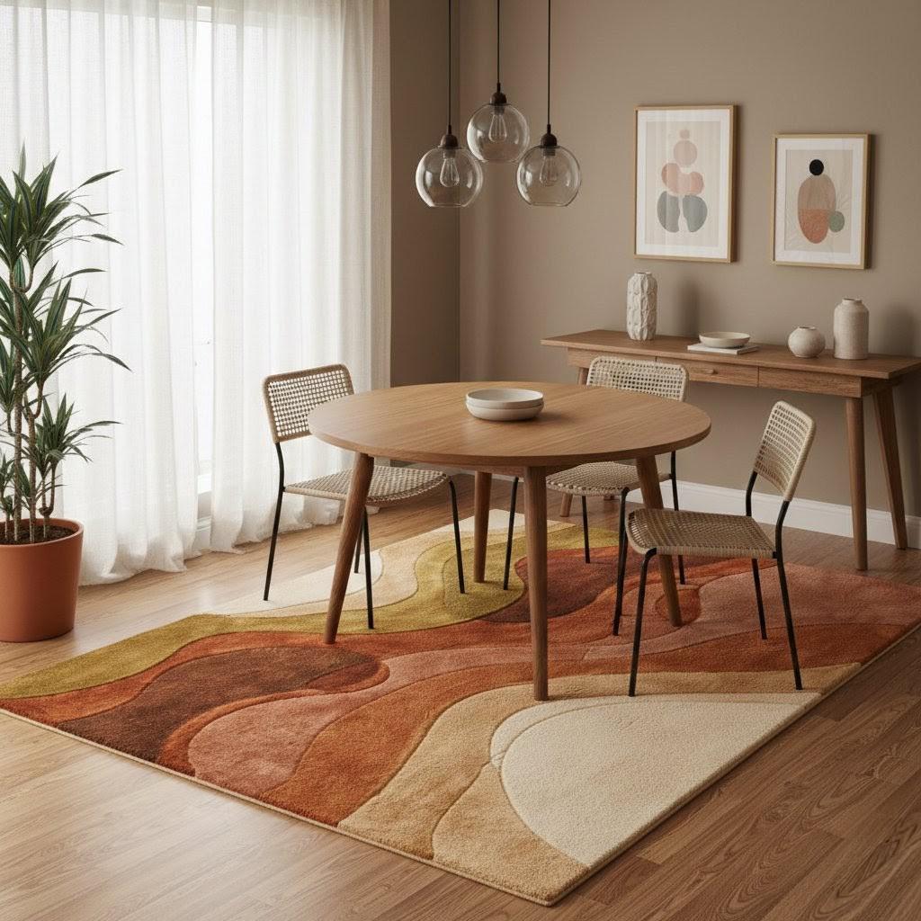 This rug is a masterful celebration of mid-century modern artistry—a flowing composition of organic curves and earthy tones that feel both nostalgic and contemporary. The design features layered waves in burnt rust, terracotta, caramel, olive green, and warm cream, creating a harmonious movement across the surface.