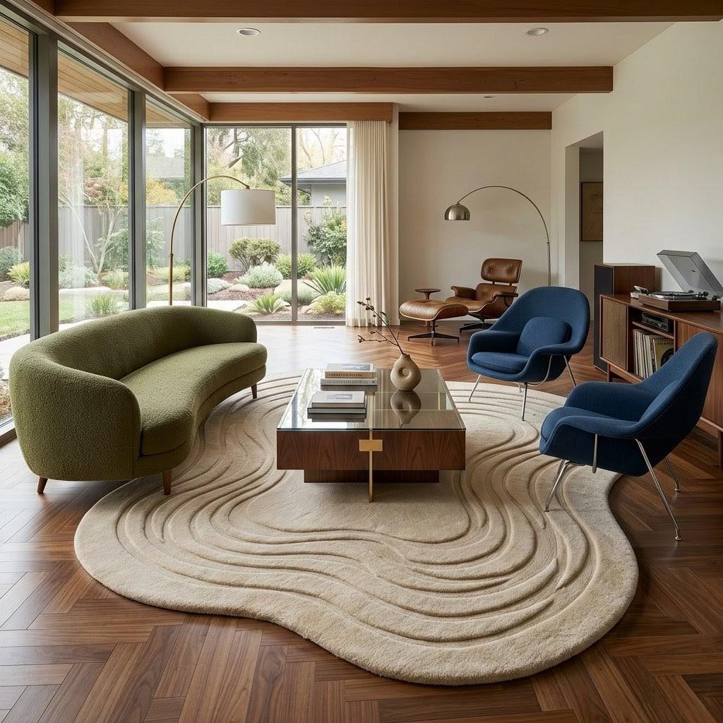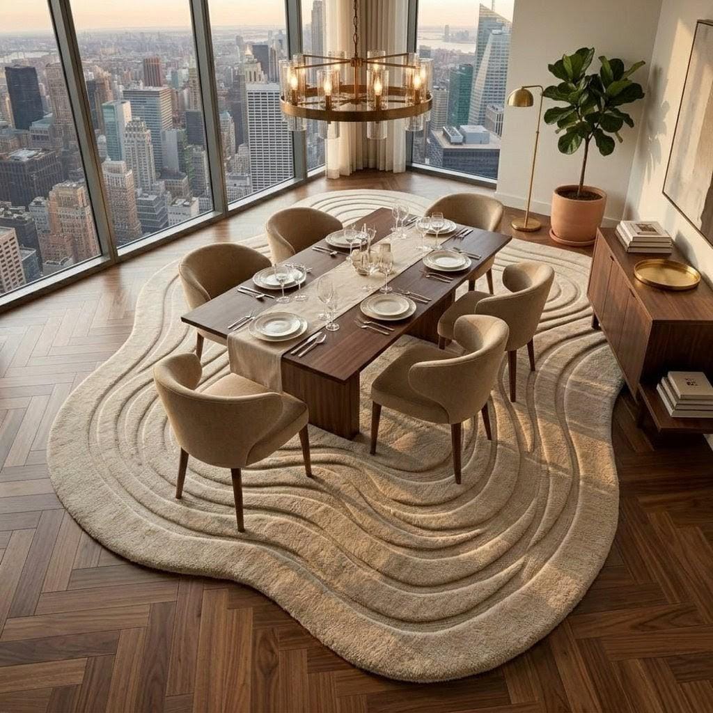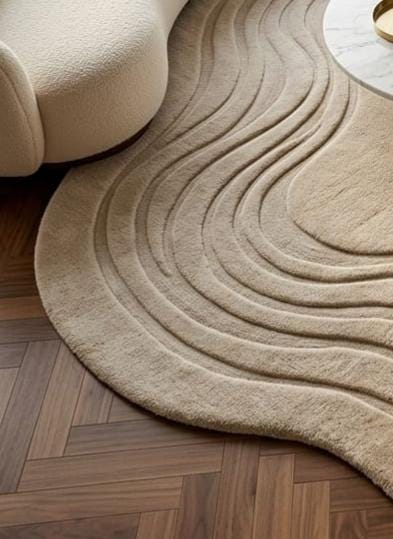 The organic silhouette breaks away from traditional rectangular rugs, offering a fluid, freeform shape that feels architectural yet calming. The raised, carved lines create dimensional depth — a subtle sculptural effect that plays beautifully with light and shadow throughout the day. This is not just a rug. It is functional art designed for refined living.