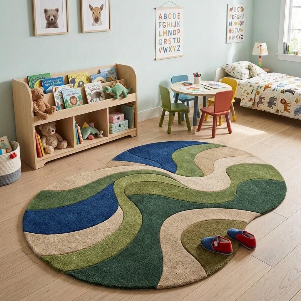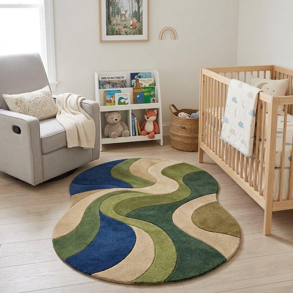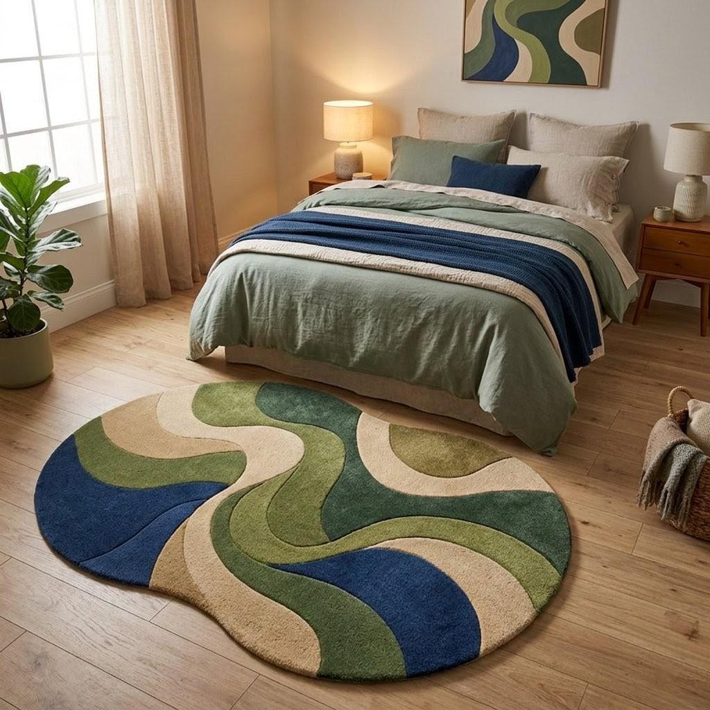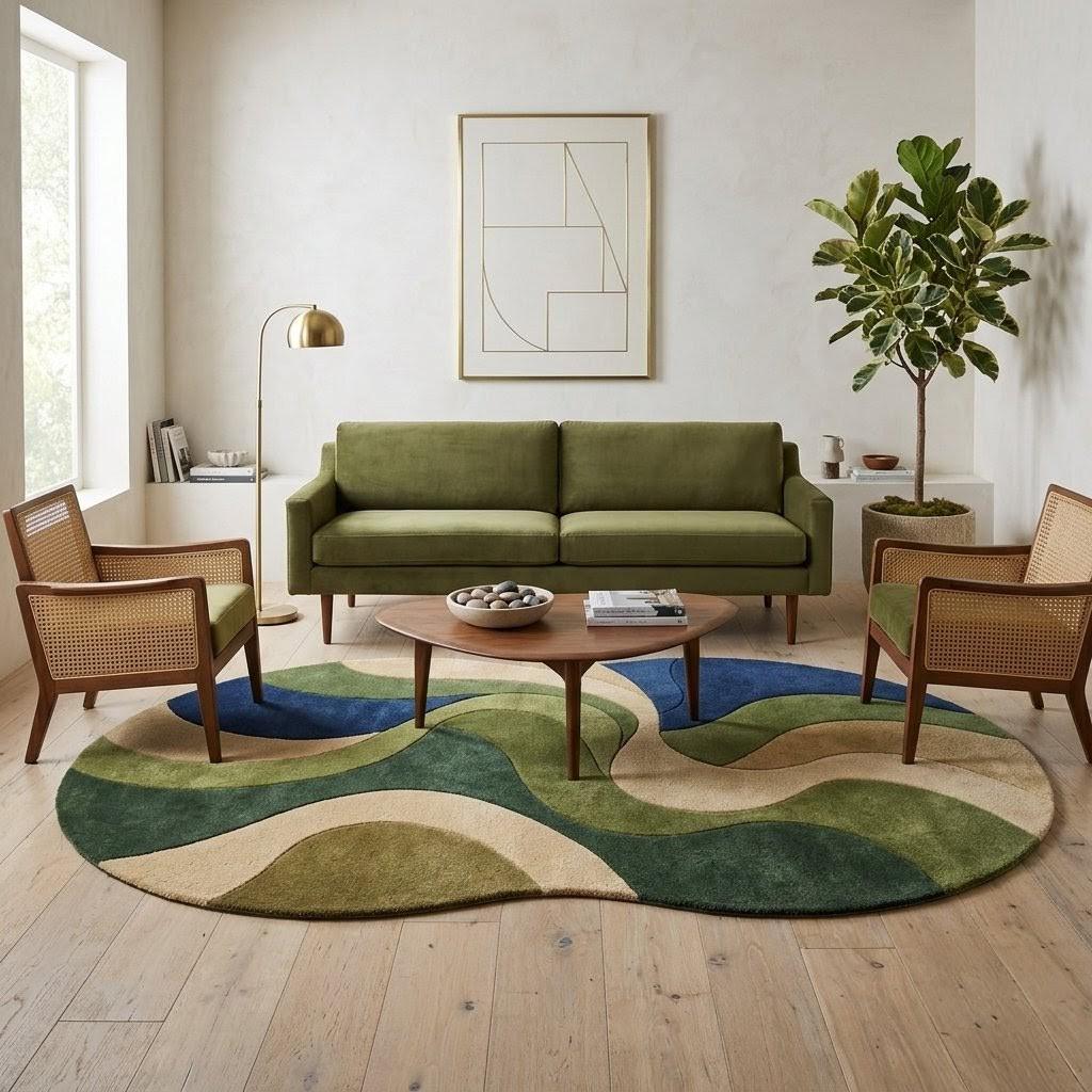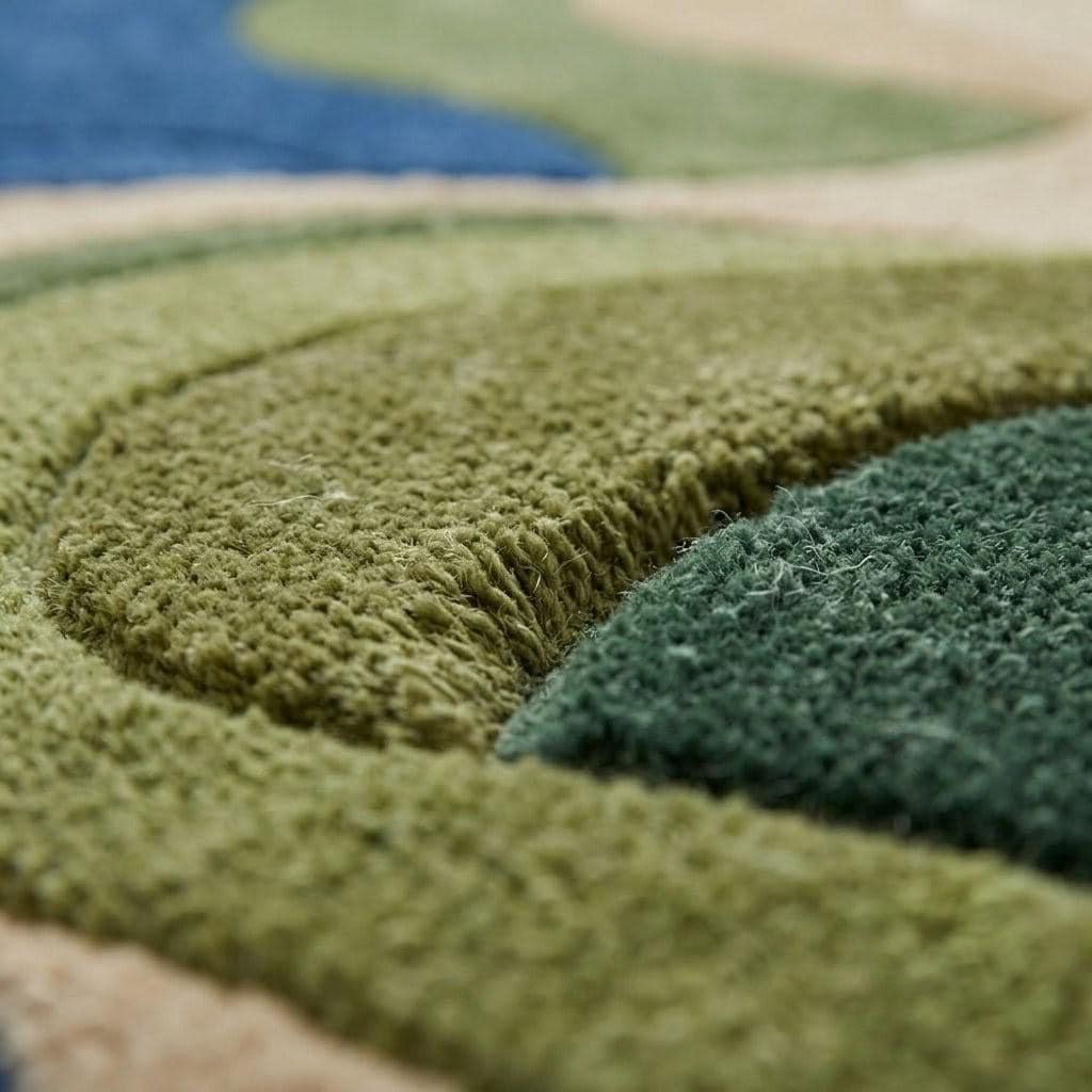 Abstract Mid Century Modern Rug Hand Tufted New Zealand Wool Green Blue Organic Shape Area Rug Plush Luxury Living Room Decor 8x10 9x12 Custom