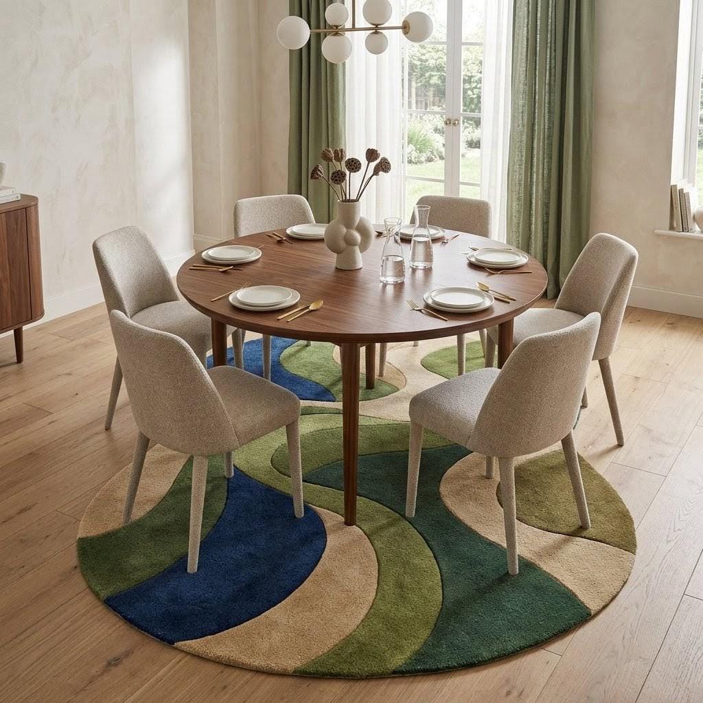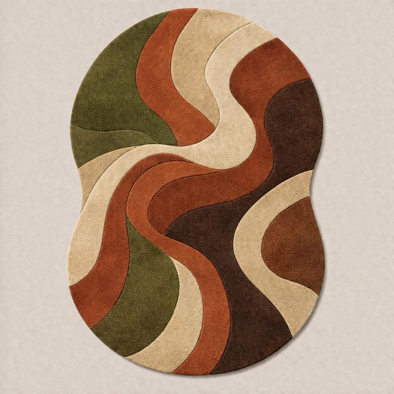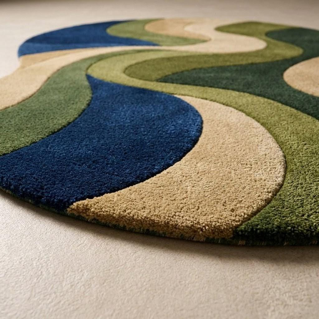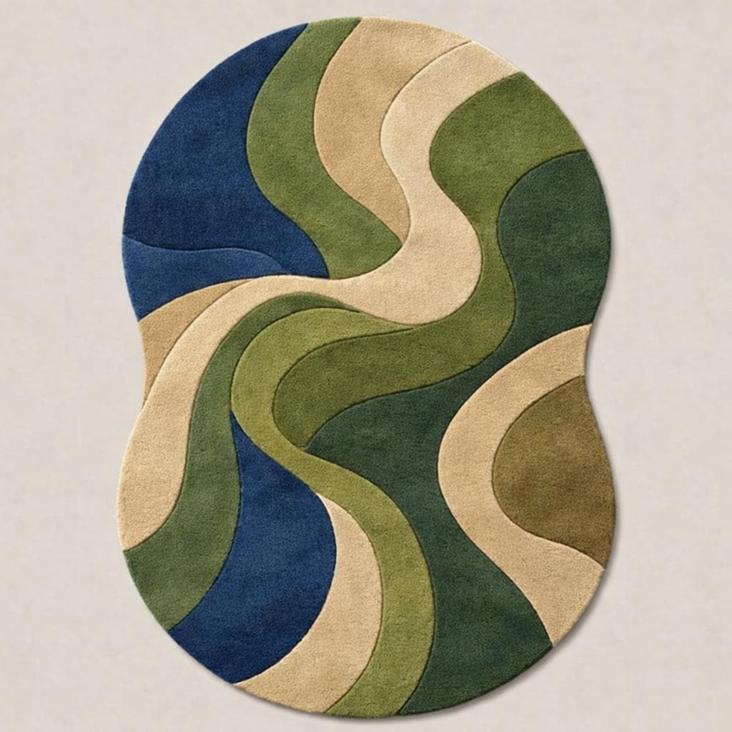 This rug is more than a floor covering—it is a piece of modern art designed for living spaces. Inspired by the flowing forms found in nature, the abstract pattern moves like winding rivers across a landscape. Layers of deep forest green, olive tones, warm sand, and rich navy blue create a sophisticated palette that feels grounding, organic, and timeless.