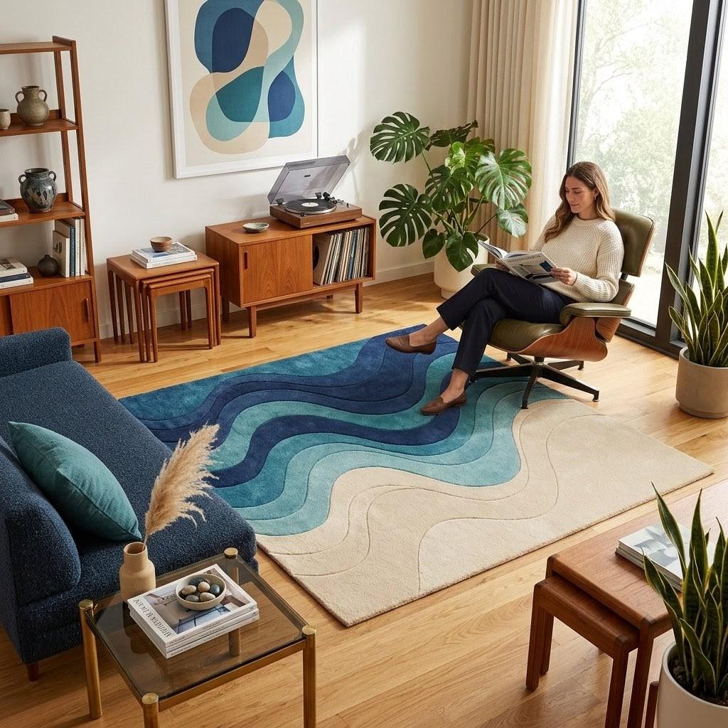 In a living room, place it beneath a sofa and coffee table to anchor the seating area with a calming visual flow.