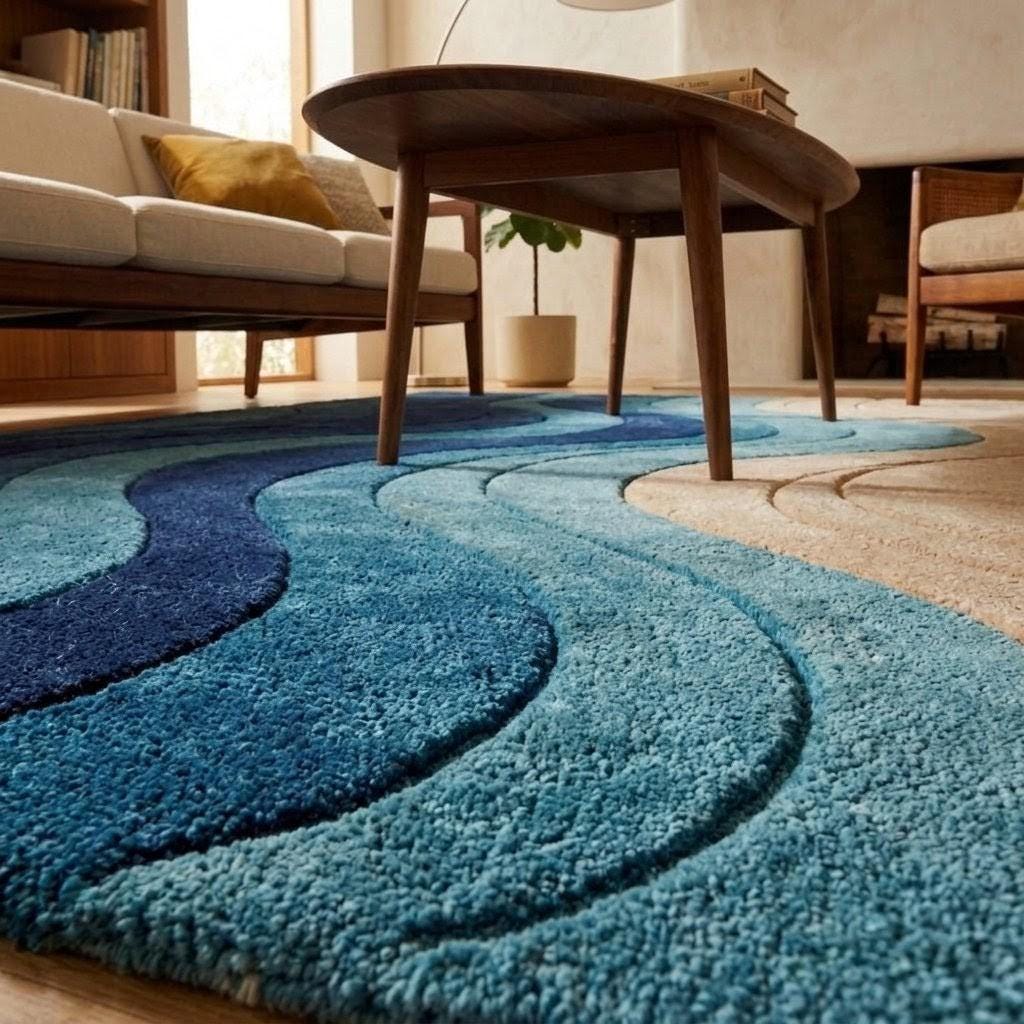 The color palette was intentionally chosen to evoke calmness and harmony. The cool blues bring a sense of tranquility while the creamy beige foundation balances the composition with warmth. The result is a modern artistic rug that feels both contemporary and timeless.