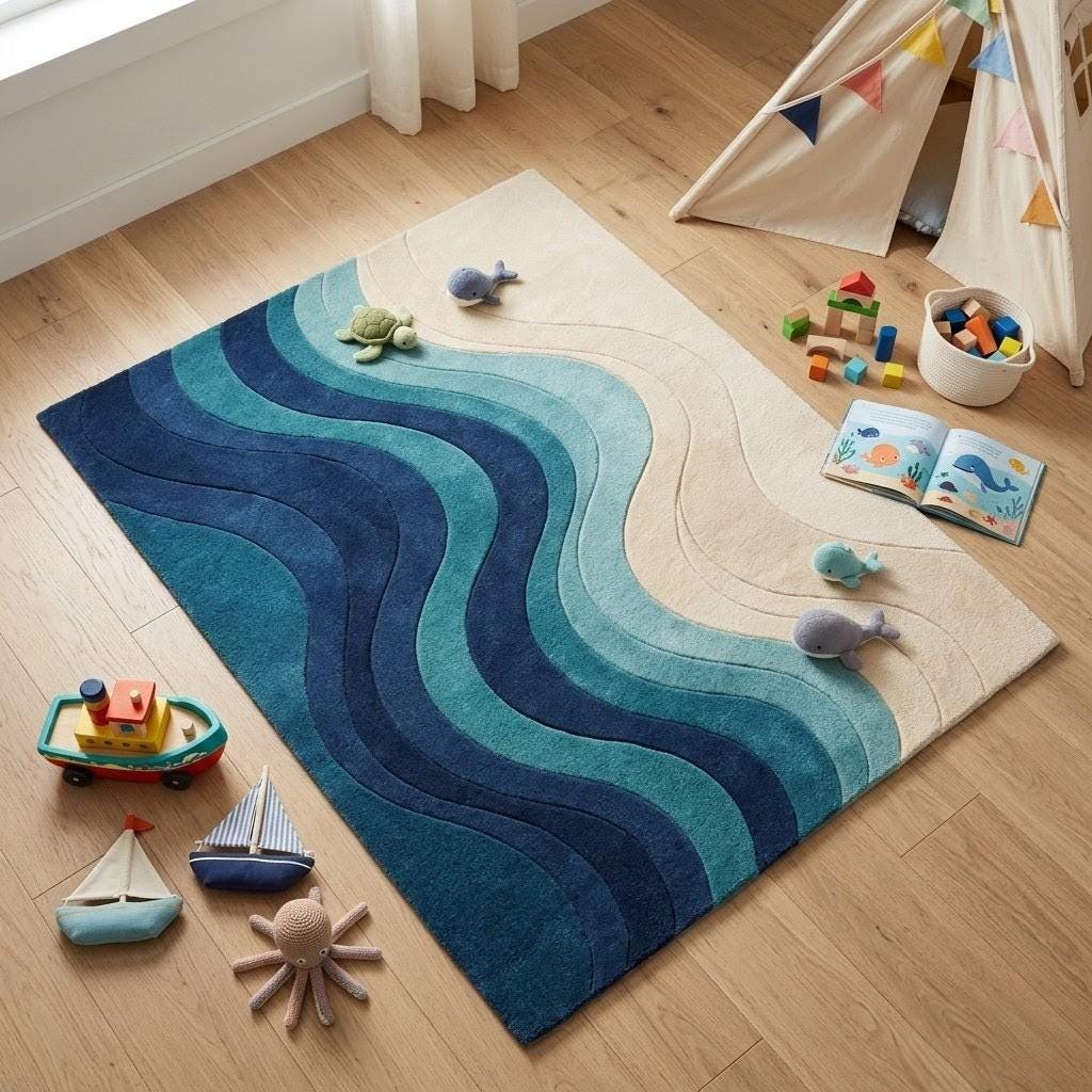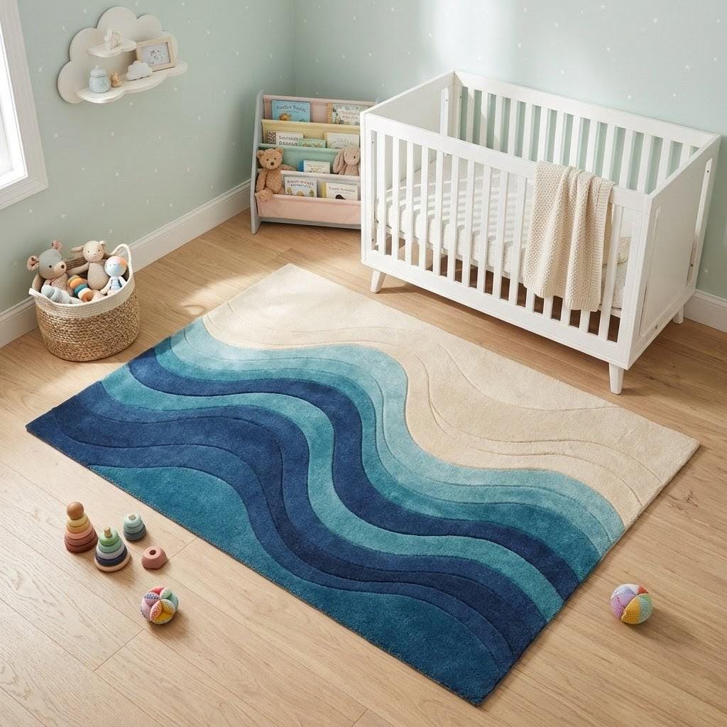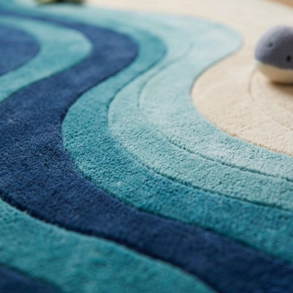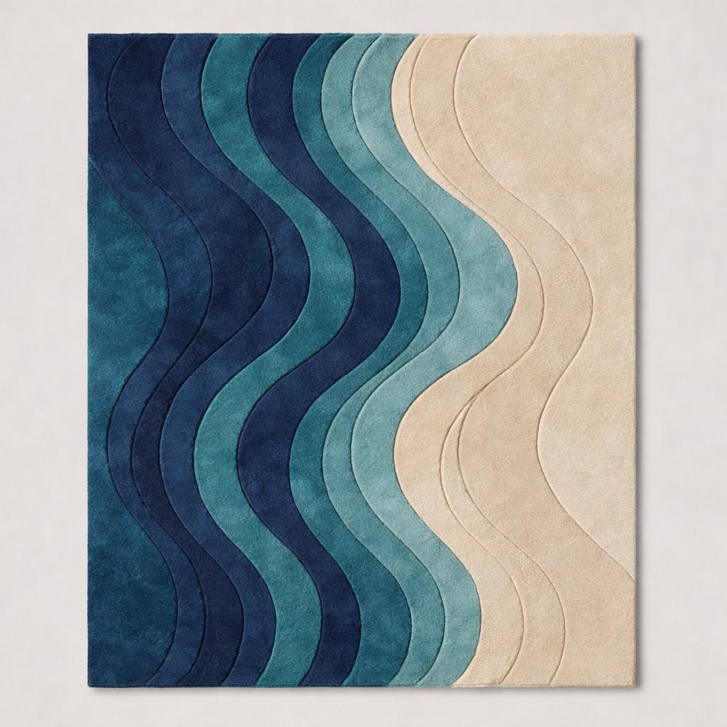 After tufting, the rug is sheared, carved, and finished by hand to enhance the flowing wave design and create subtle texture variations throughout the pattern.