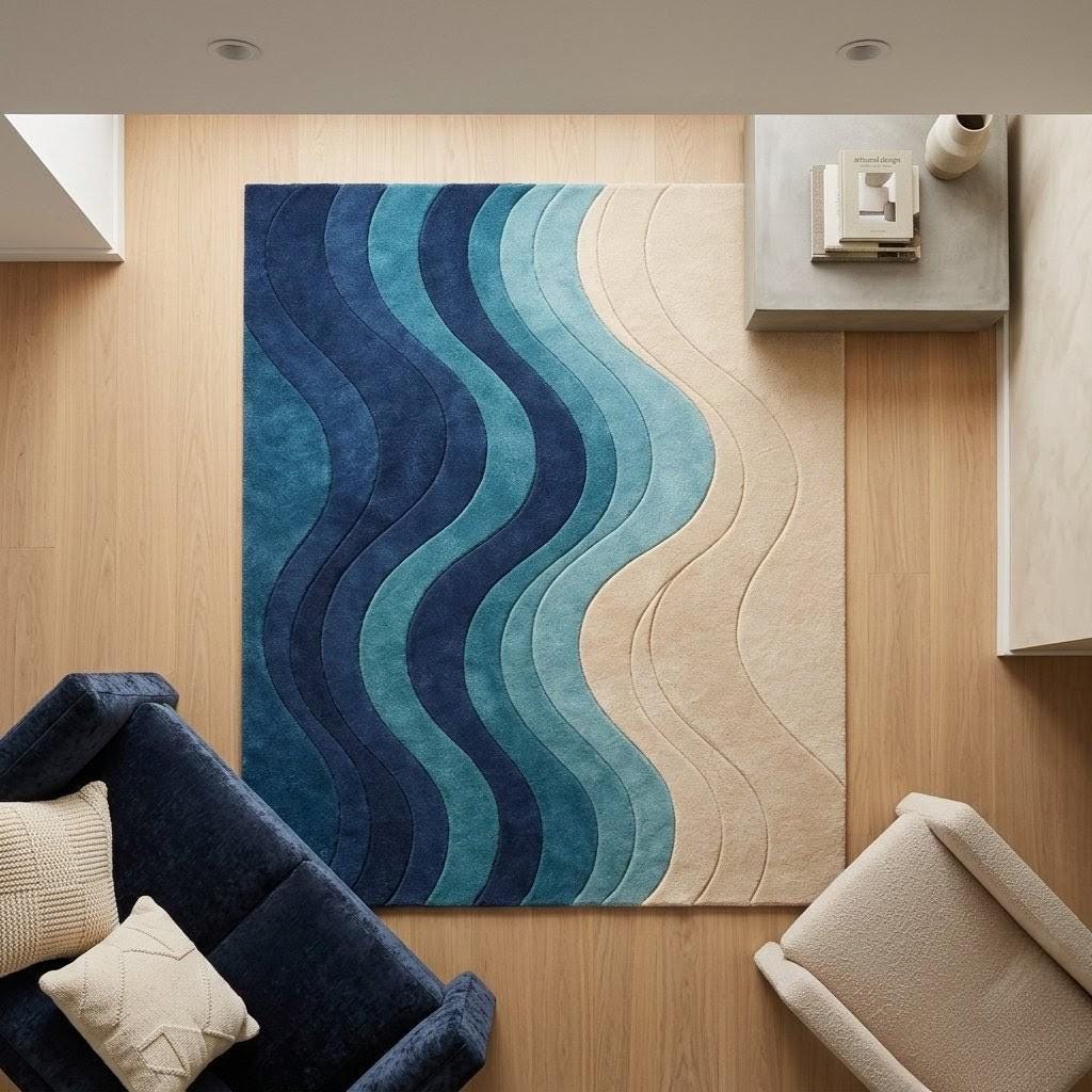 Modern Wave Area Rug Hand Tufted New Zealand Wool Blue Beige Abstract Rug Mid Century Luxury Living Room Carpet 8x10 9x12 Custom Size
