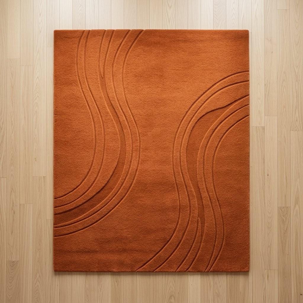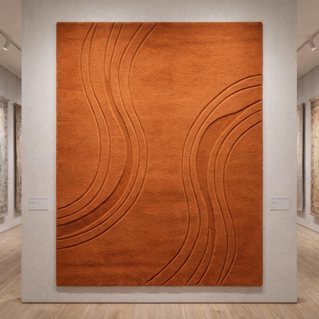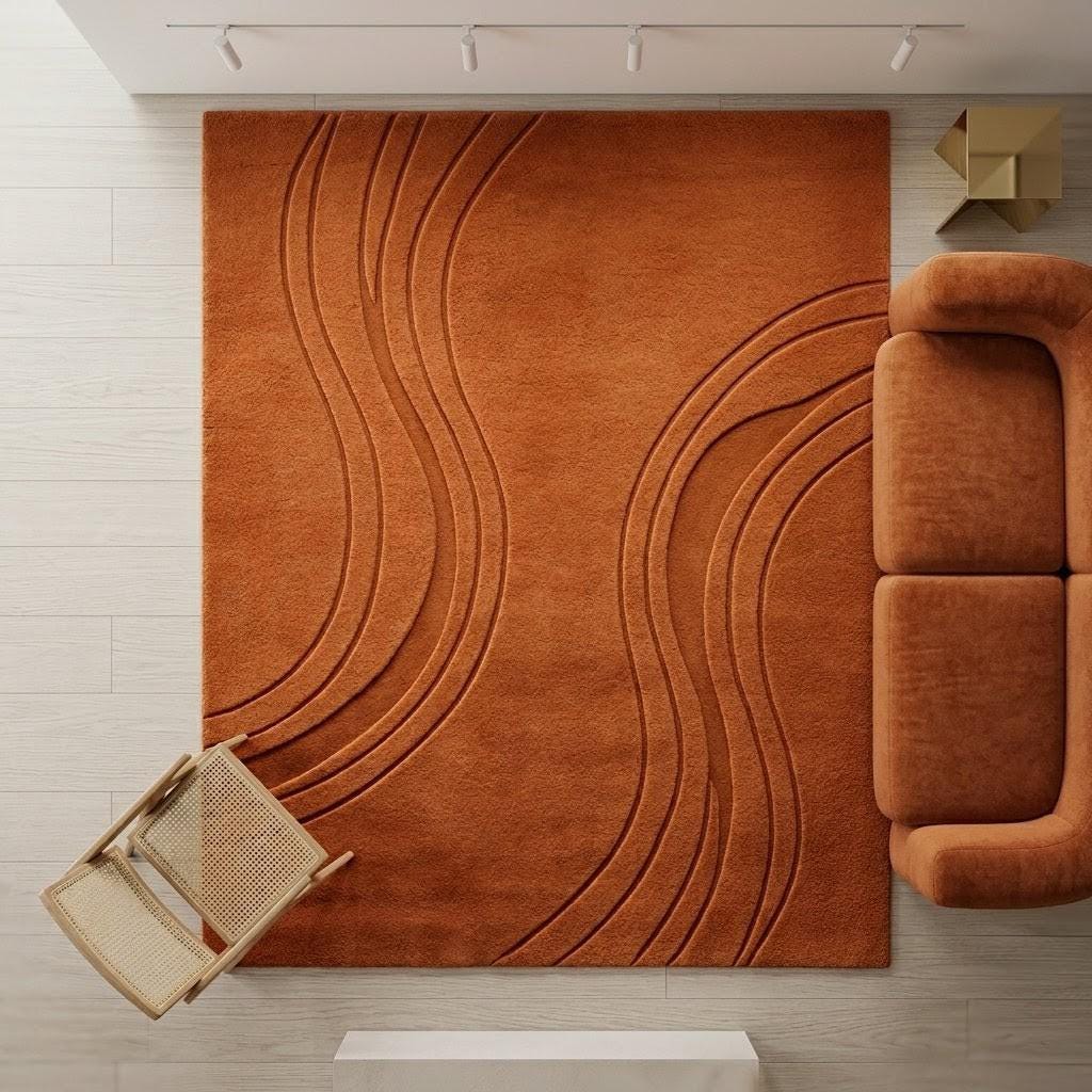 This sculpted terracotta rug was designed to embody movement, warmth, and modern artistic expression. Inspired by organic landscapes and flowing topographic patterns, the carved lines create a sense of rhythm across the surface—almost like wind moving across desert dunes or waves shaping sand.