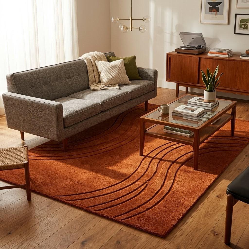 The rich burnt orange and terracotta palette instantly brings warmth and depth to any interior. It captures the timeless appeal of mid-century modern design, while the abstract sculpted curves add a contemporary artistic edge.