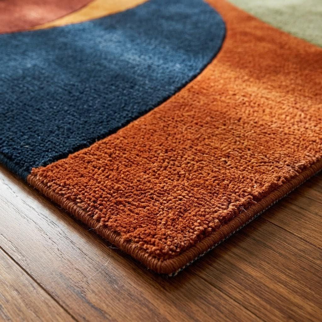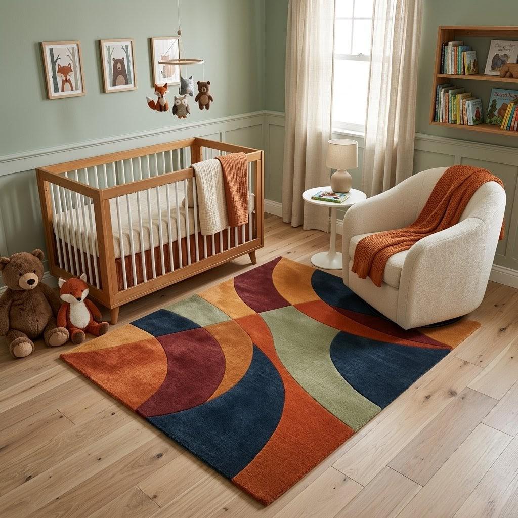 The design draws inspiration from 1960s modernist art and Scandinavian interior aesthetics, where bold shapes and earthy palettes create spaces that feel stylish yet inviting. Whether placed in a living room, creative studio, or nursery, this rug acts as an art piece for the floor, instantly elevating the atmosphere of the room.