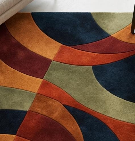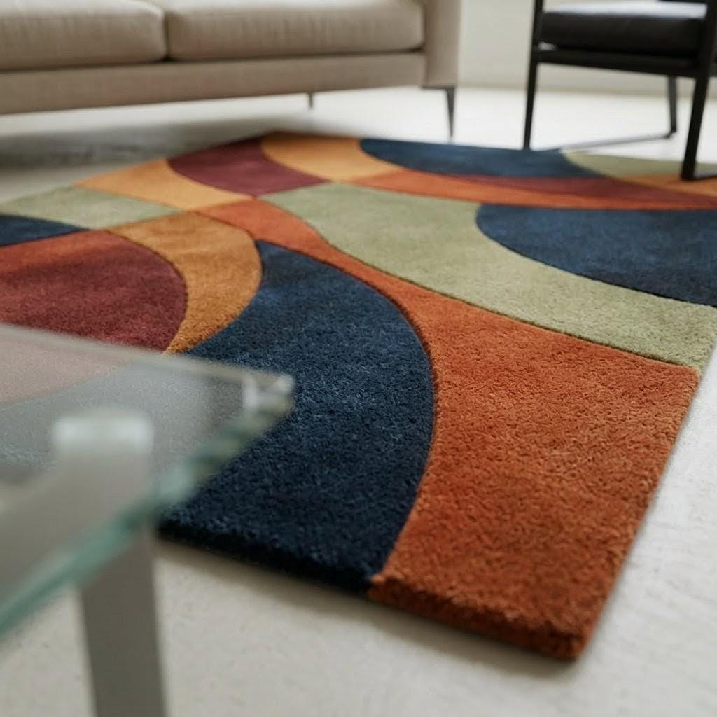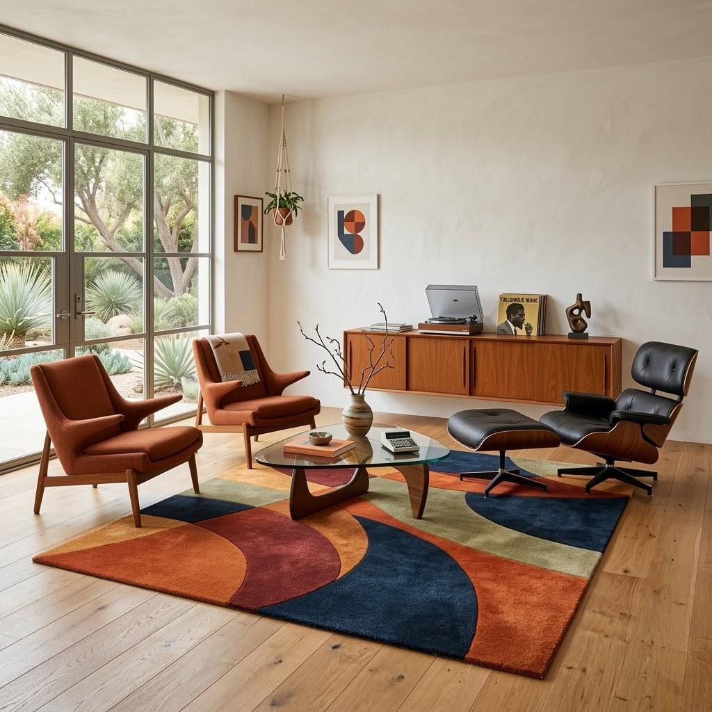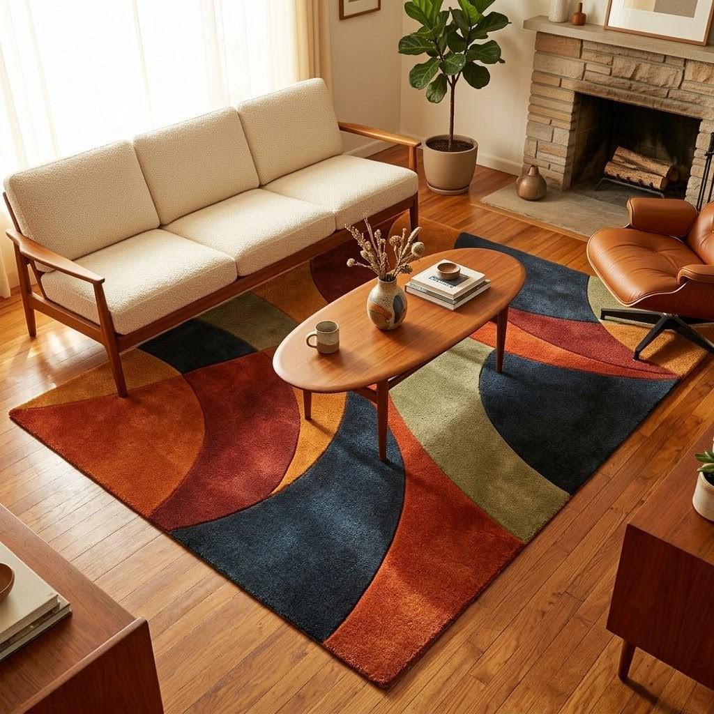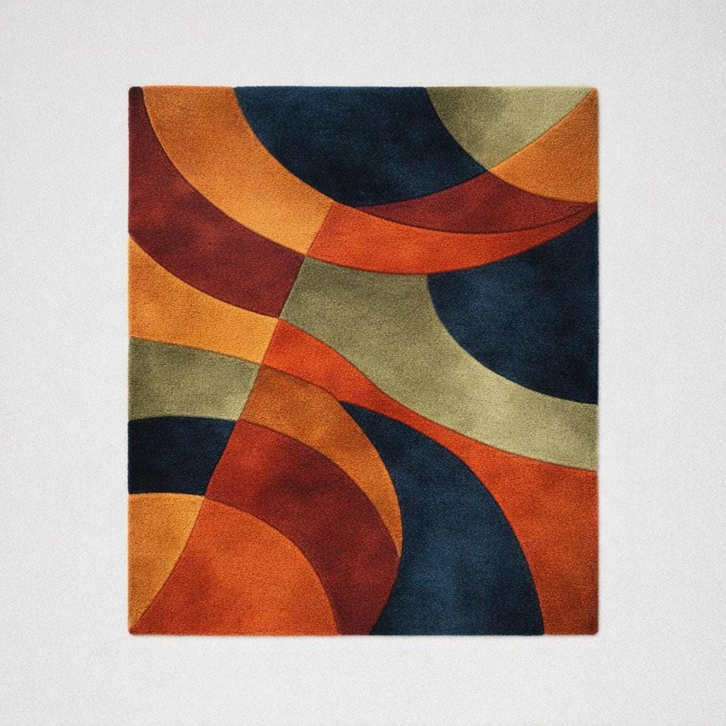 This striking rug is a celebration of mid-century modern design, where geometry, color, and movement come together to create visual harmony. The abstract curved shapes flow effortlessly across the surface, forming a dynamic composition that feels both artistic and balanced.