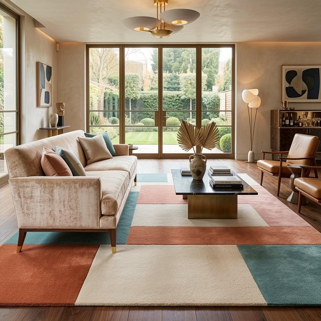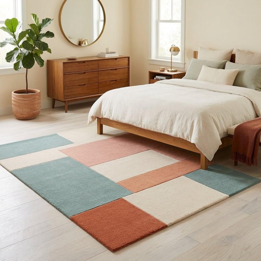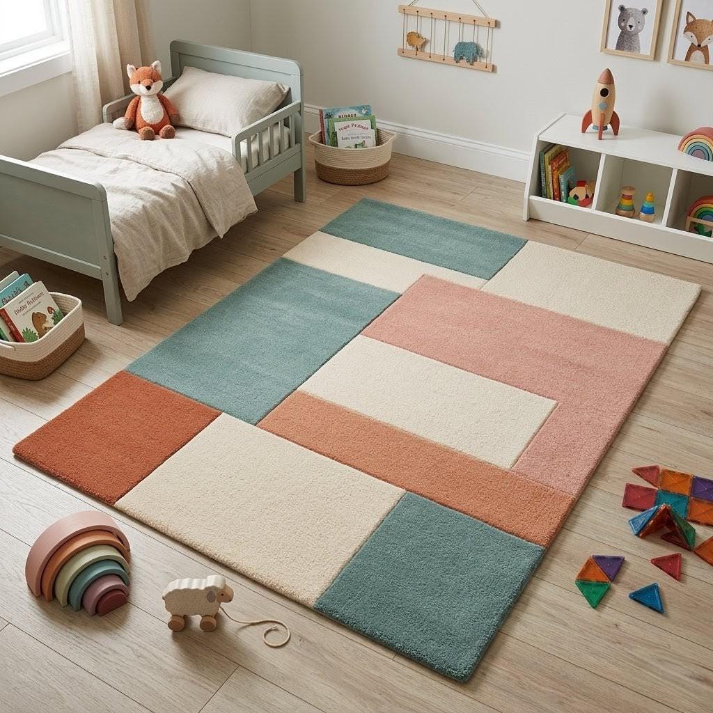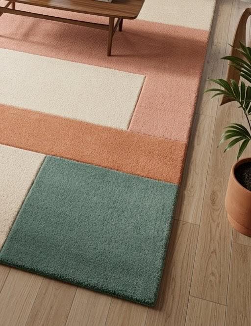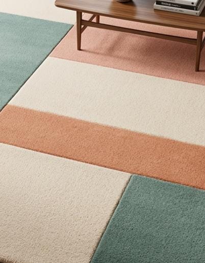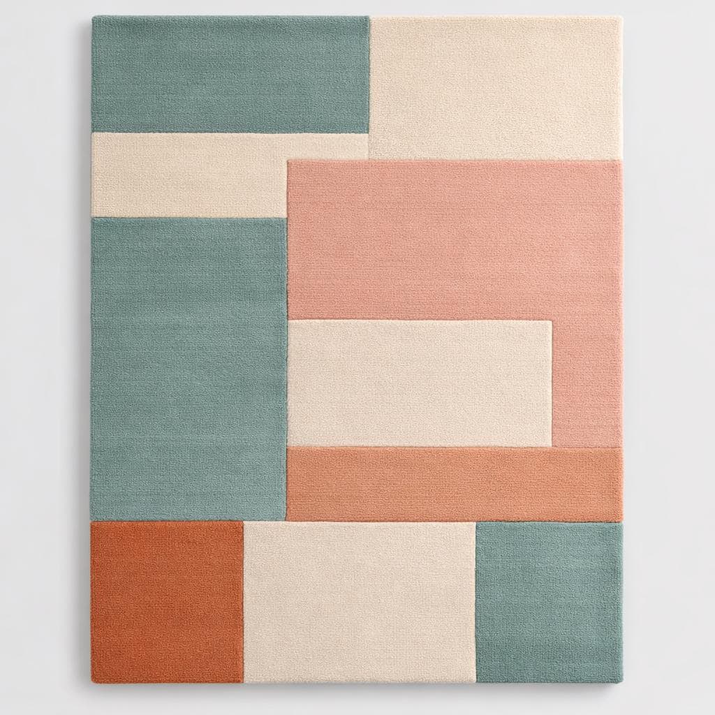 The palette blends warm terracotta, calming sage green, soft cream, and muted coral, forming a soothing yet sophisticated composition. Each rectangular section interacts with the others like pieces of modern abstract art, making the rug feel like a curated design element rather than just a functional floor covering.