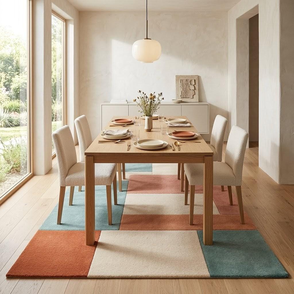 This geometric wool rug is a celebration of modern design and timeless craftsmanship. Inspired by mid-century modern interiors and Scandinavian minimalism, the rug features a carefully balanced arrangement of soft color blocks that create visual harmony without overwhelming the space.