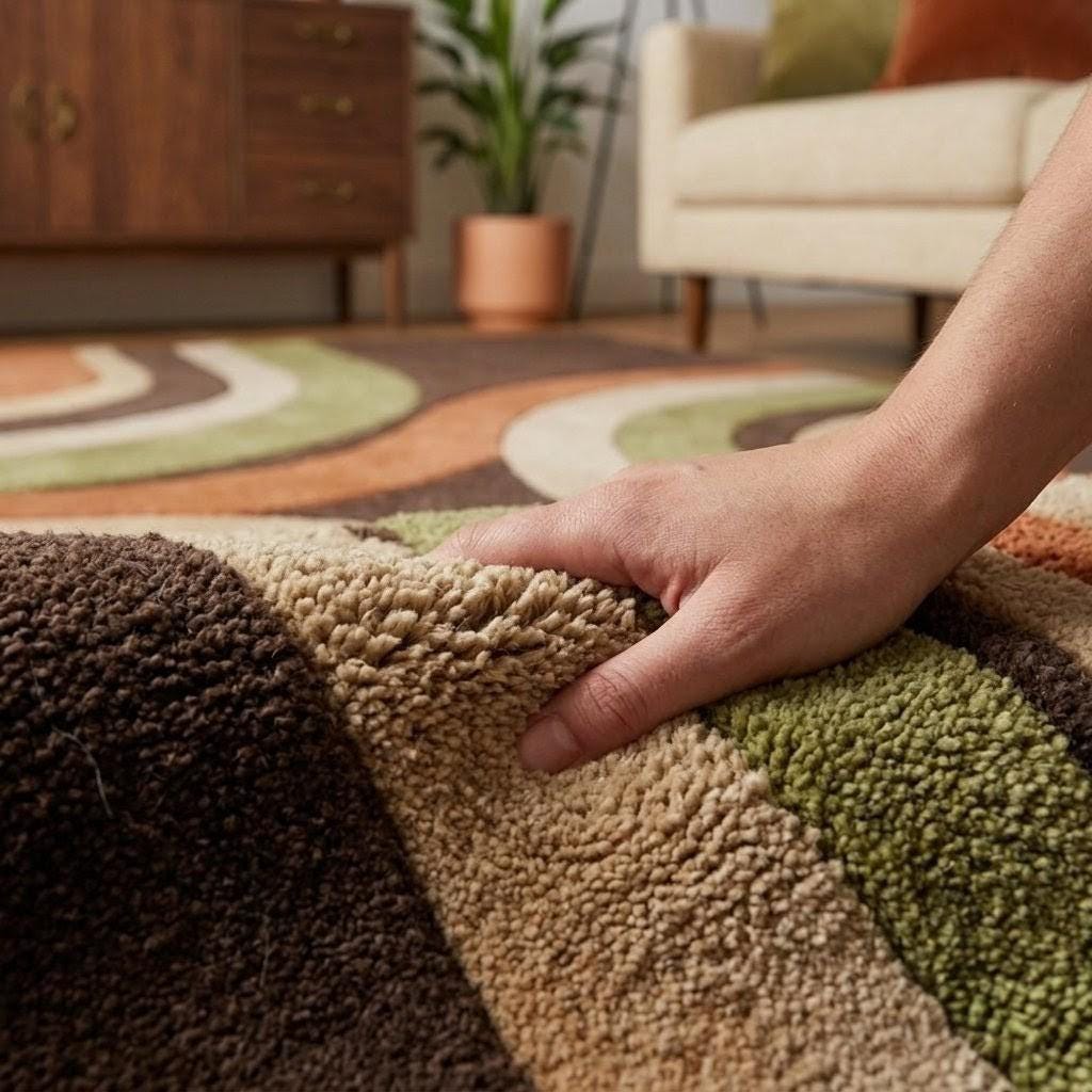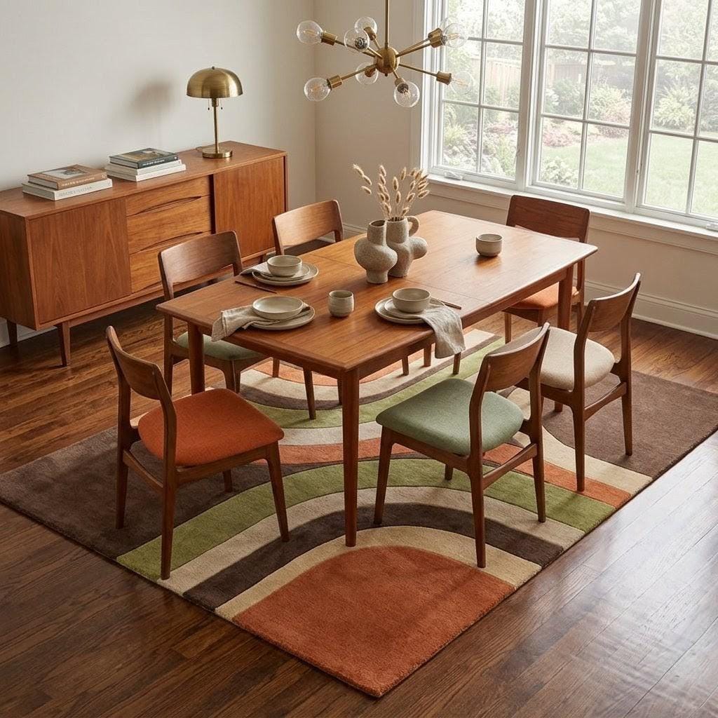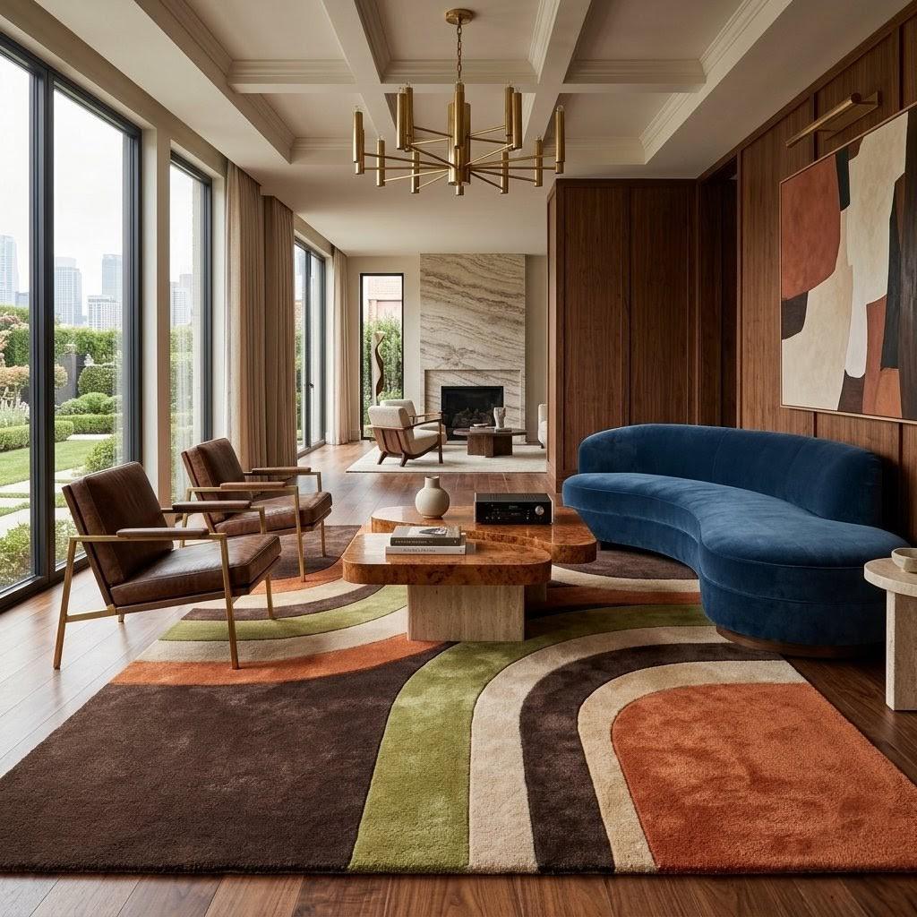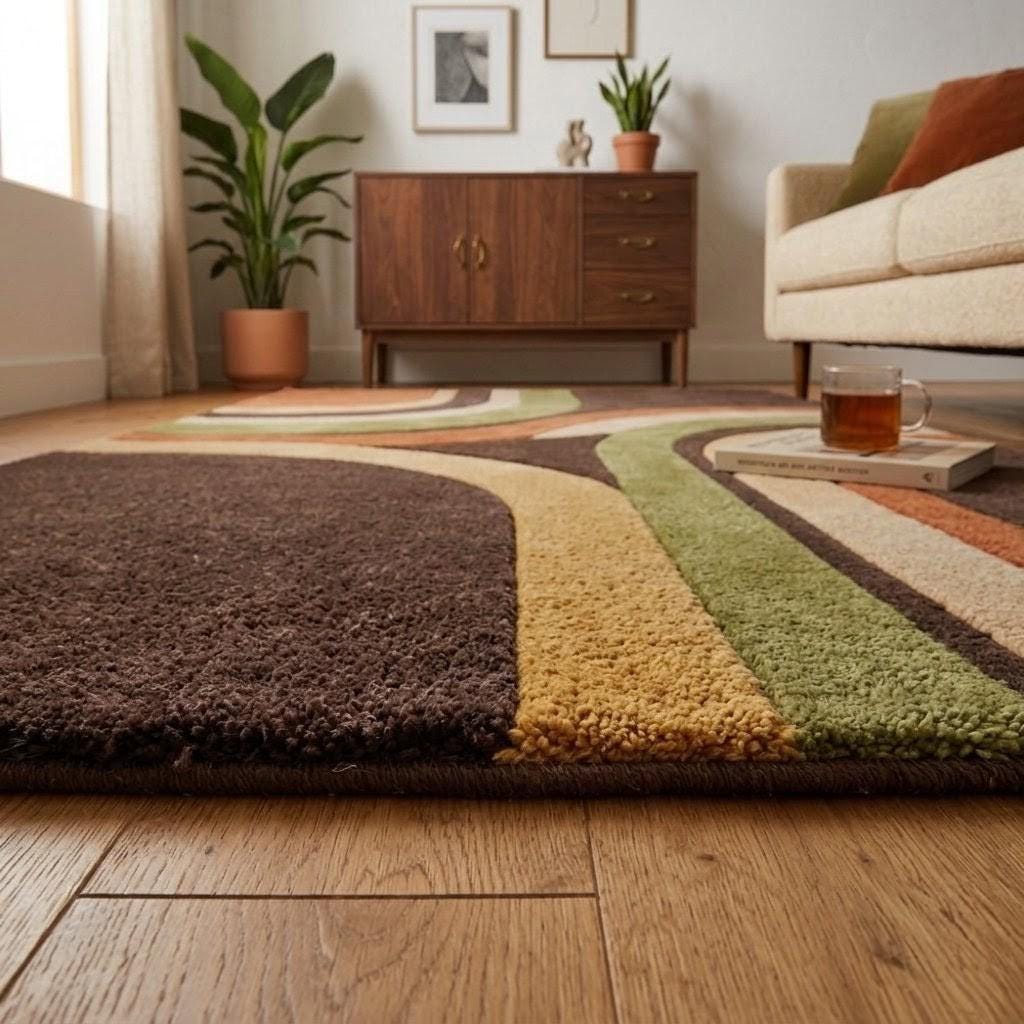This rug is a celebration of iconic mid-century modern design, where bold geometry meets organic flow. The sweeping curved lines create a harmonious rhythm across the surface, guiding the eye effortlessly from one corner to the next. Earthy tones of rich brown, burnt orange, olive green, and creamy beige evoke a grounded, retro aesthetic that feels both nostalgic and strikingly contemporary. The interplay of curves and color blocking brings a sense of movement and energy, making this rug not just a floor covering, but a true statement piece—like abstract art beneath your feet