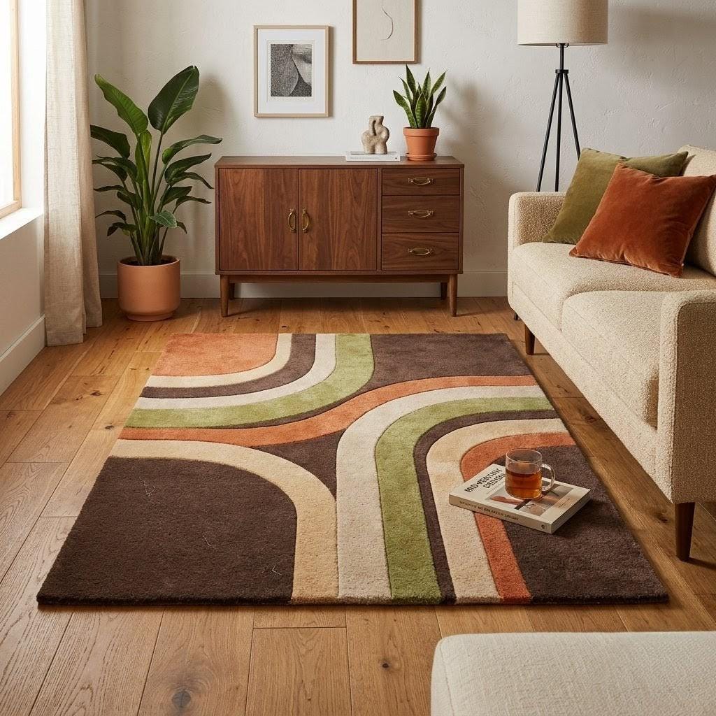 Mid Century Modern Area Rug Hand Tufted Wool Retro Geometric Brown Green Orange Plush Living Room Decor 8x10 9x12 Custom Size