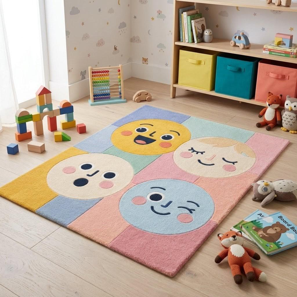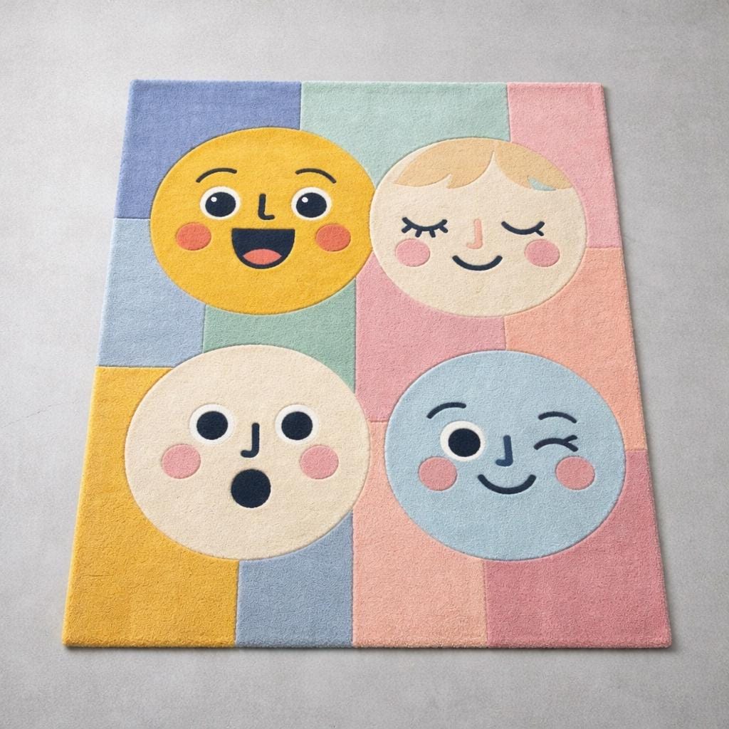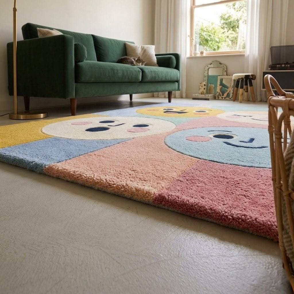 This rug features a charming grid of expressive smiley faces in soft pastel tones—yellow, blush pink, baby blue, and warm cream. The playful, modern aesthetic blends Scandinavian minimalism with whimsical pop-art vibes, making it a standout statement piece while still feeling soft and harmonious in any interior.