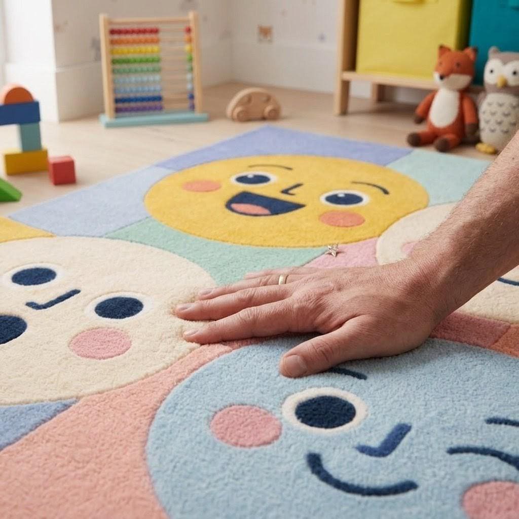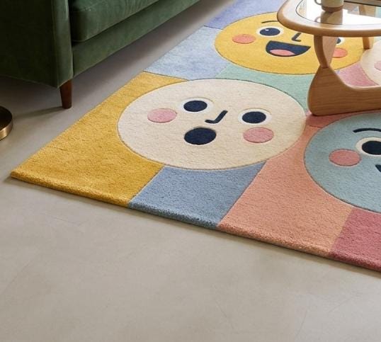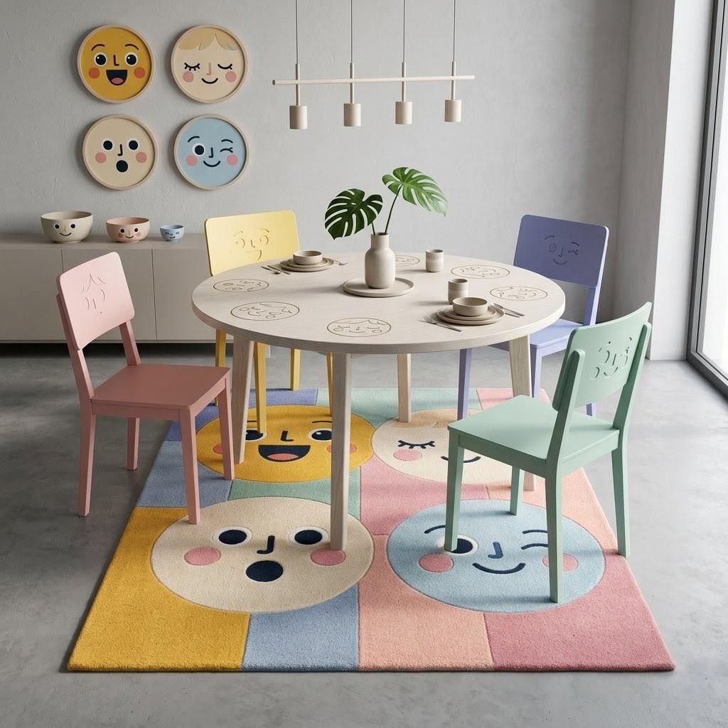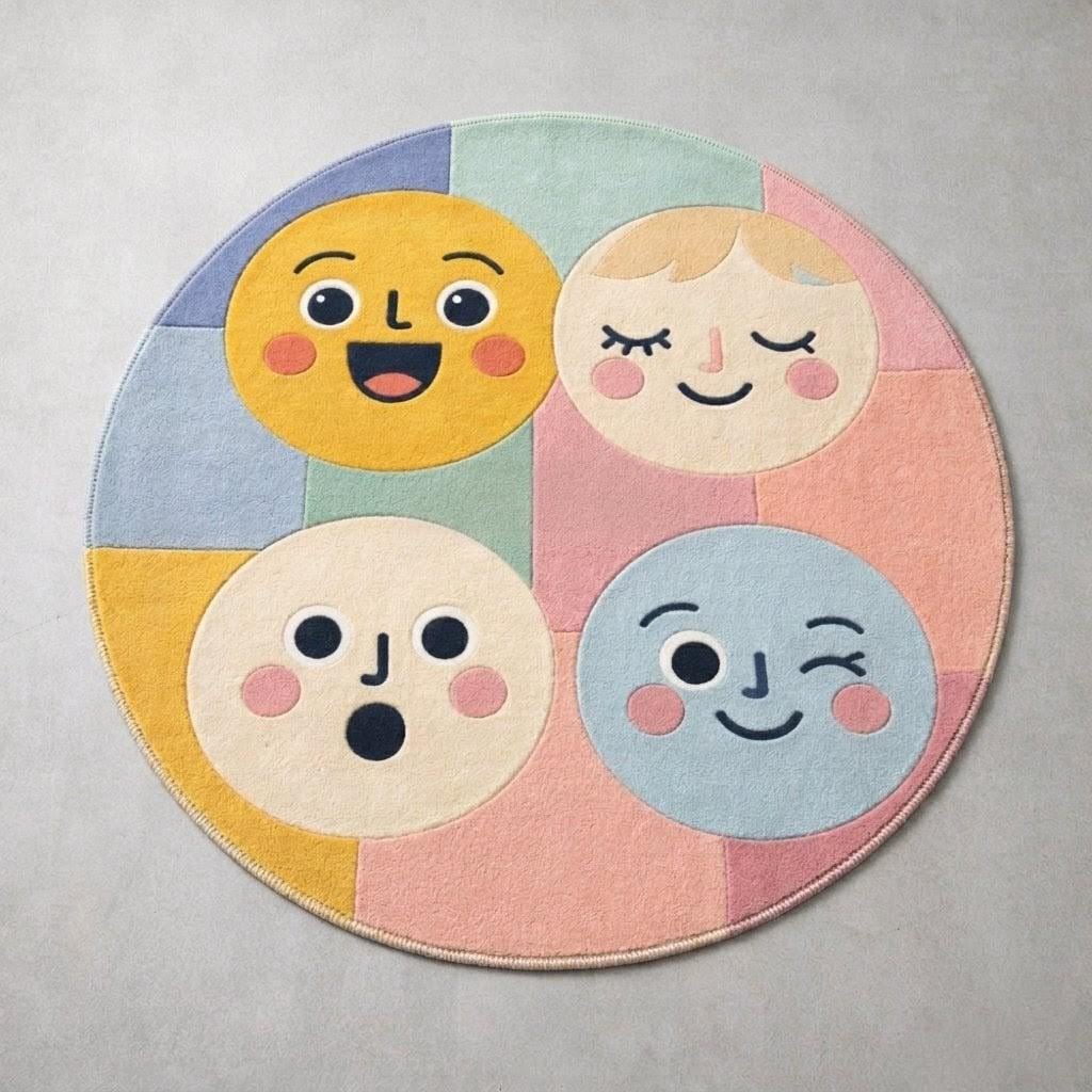 This rug features a charming grid of expressive smiley faces in soft pastel tones—yellow, blush pink, baby blue, and warm cream. The playful, modern aesthetic blends Scandinavian minimalism with whimsical pop-art vibes, making it a standout statement piece while still feeling soft and harmonious in any interior.
