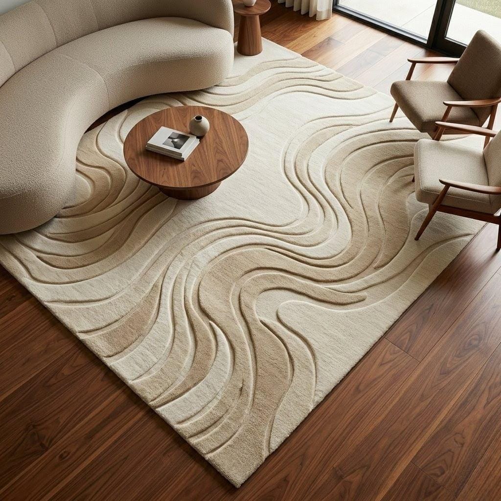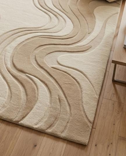 Hand Tufted Wool Rug, Abstract Beige Cream Wavy Carpet, Modern Scandinavian Living Room