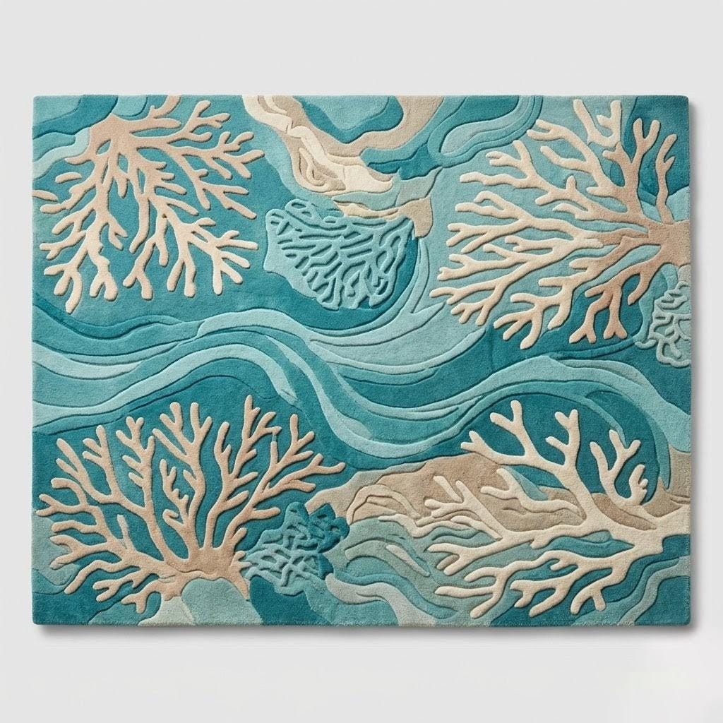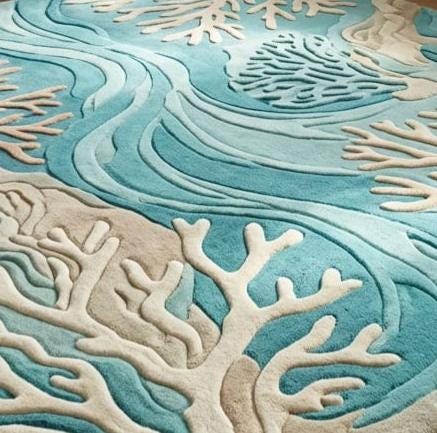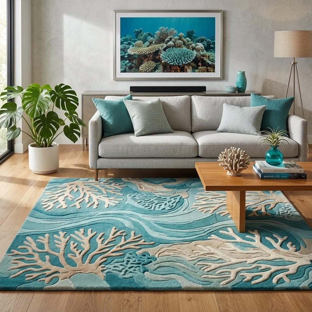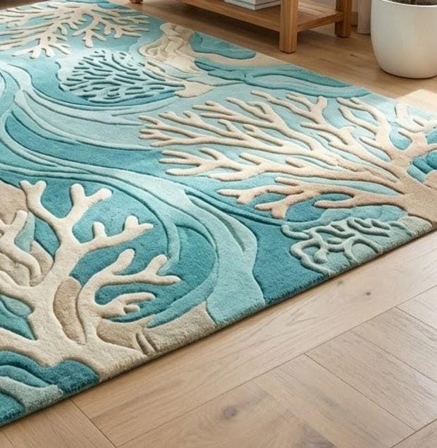 Inspired by the rhythmic flow of ocean currents and the intricate beauty of coral reefs, this rug features a sophisticated Coastal Modern aesthetic. The raised 3D design creates a sculptural effect, making the ivory coral branches "pop" against the vibrant teal and azure blue background. It’s a perfect statement piece for those looking to blend organic patterns with a contemporary, high-fashion edge.