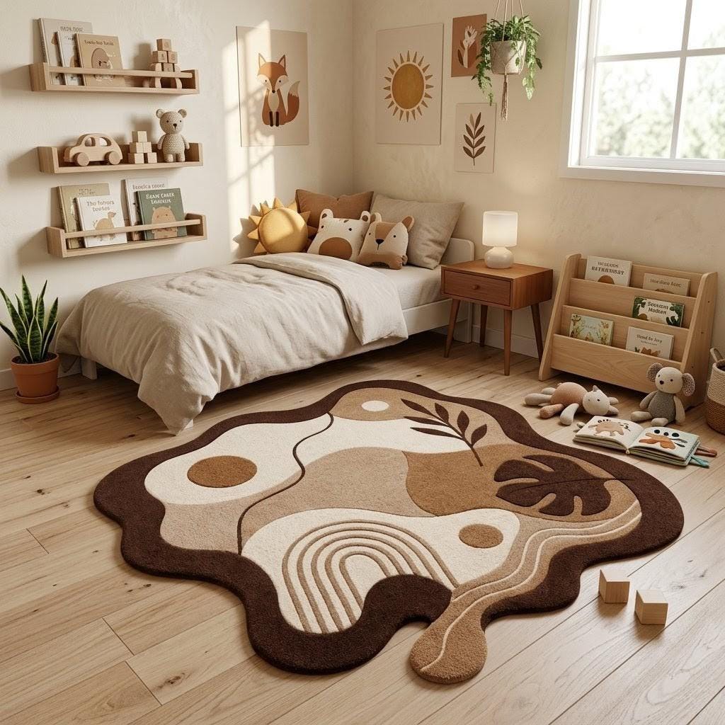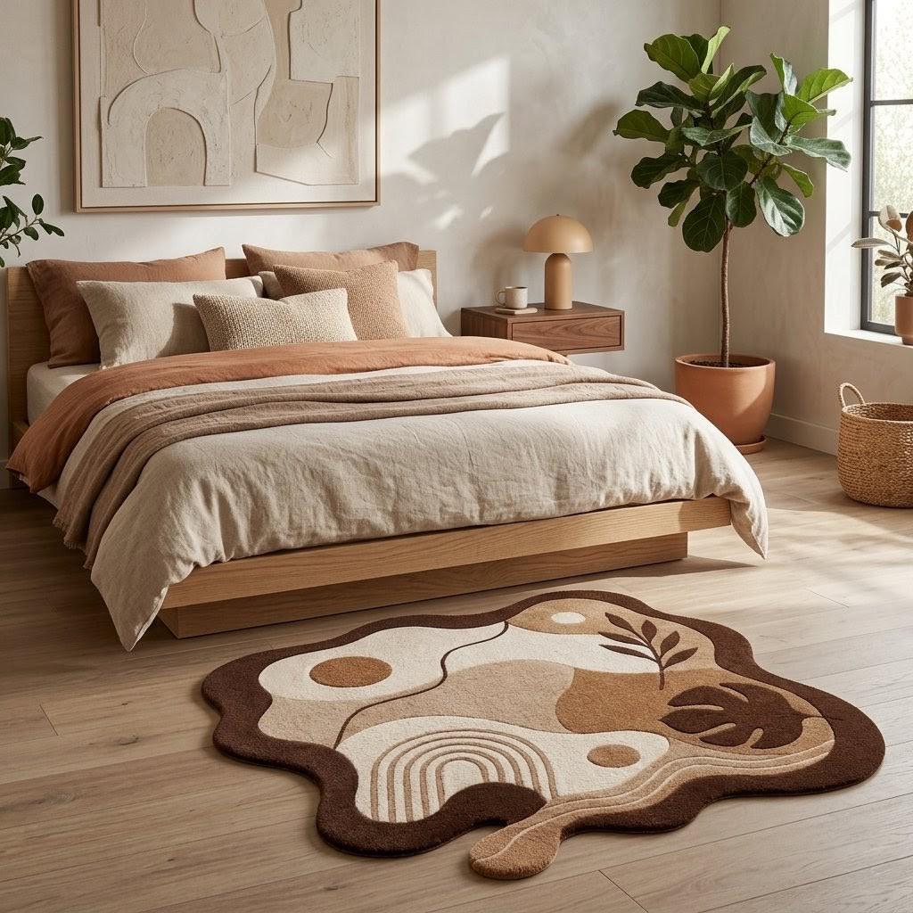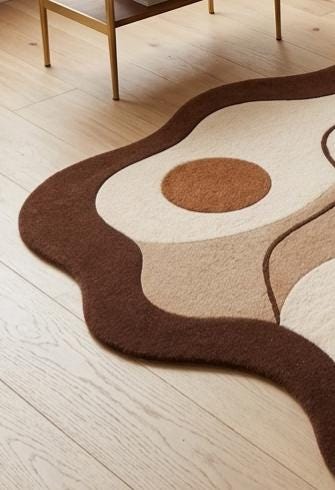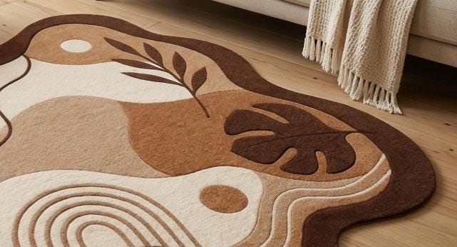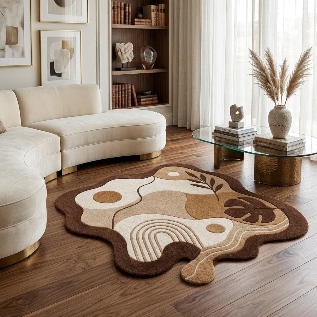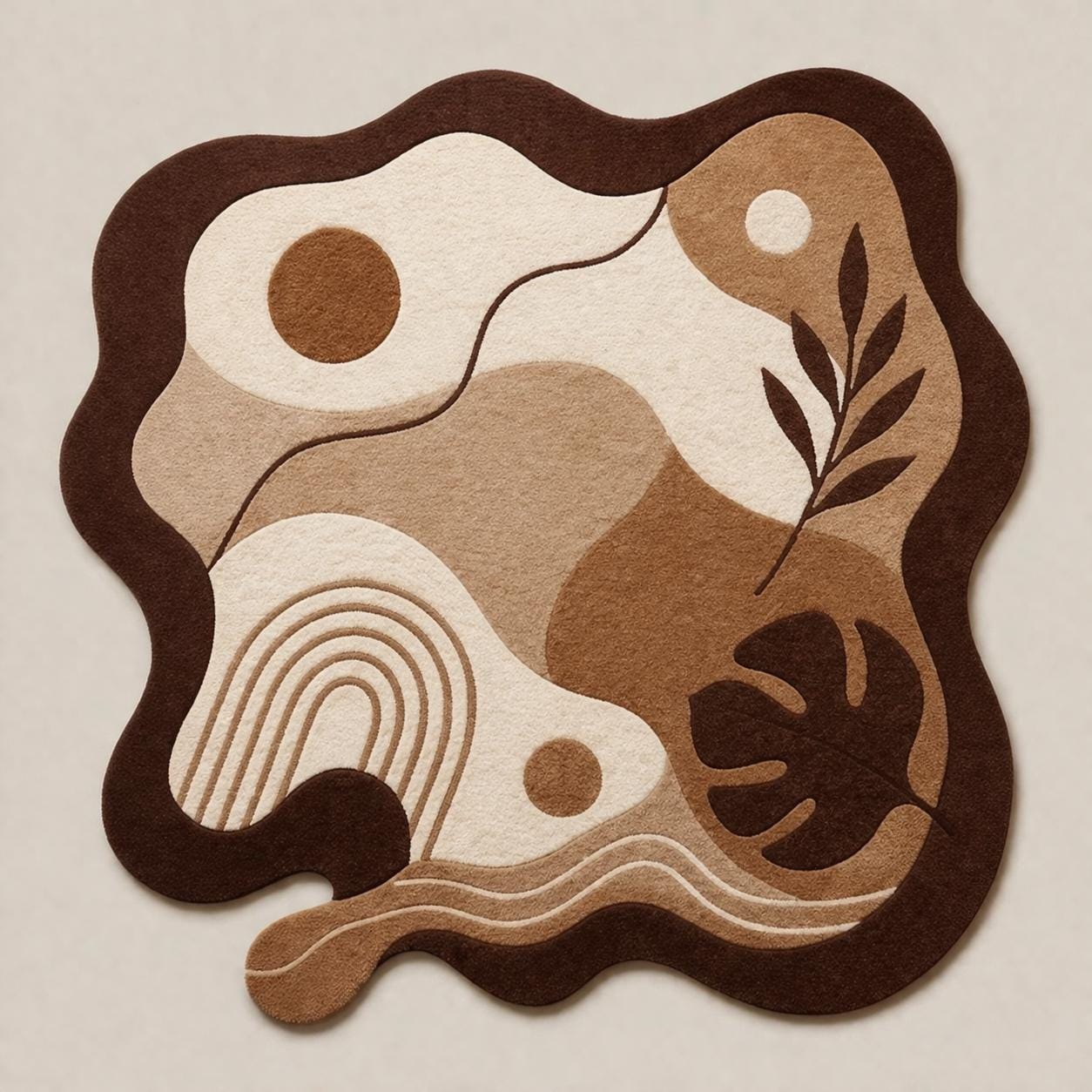 Bring the outdoors in with this sophisticated, artisanal area rug. Featuring a striking yet calming abstract composition of organic "blob" shapes, contrasting geometric archways, and sculpted botanical elements like monstera and palm leaves, this rug is a true statement piece. Available in a curated palette of earthy browns, warm beige, and creamy white, it perfectly complements Mid-Century Modern, Japandi, Boho, or Contemporary Scandinavian interior designs.