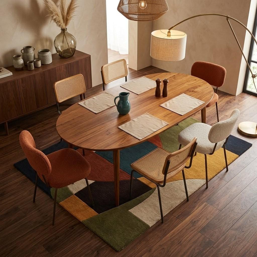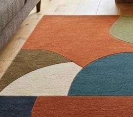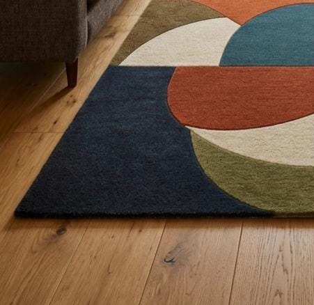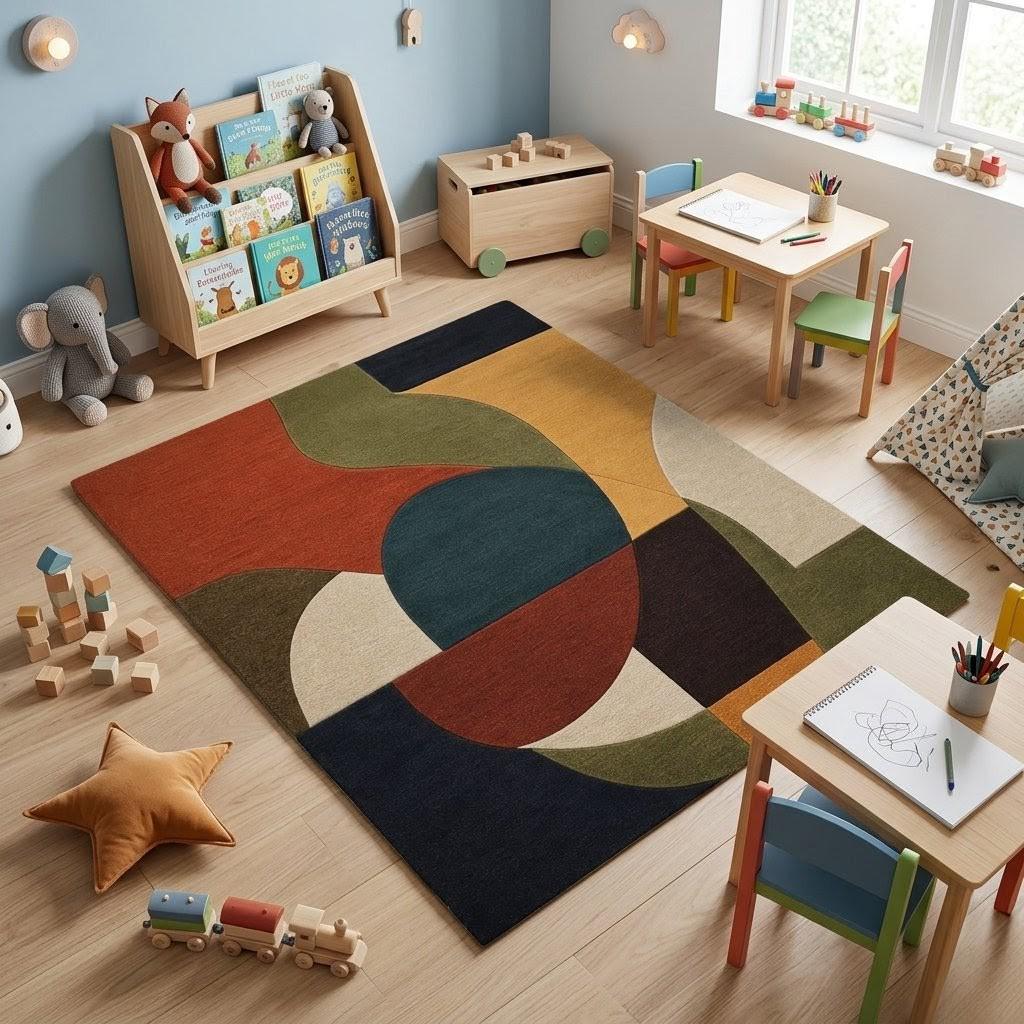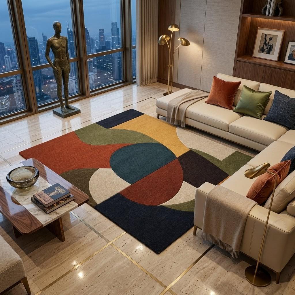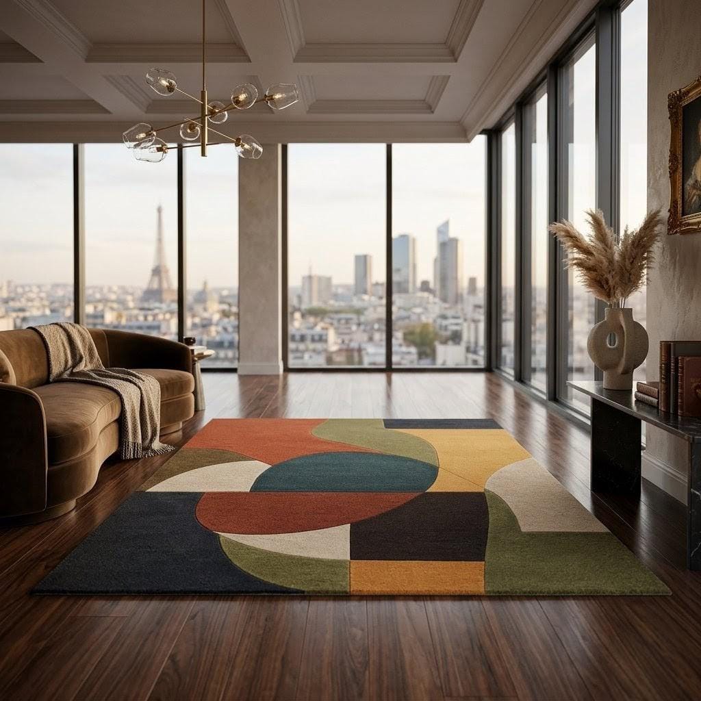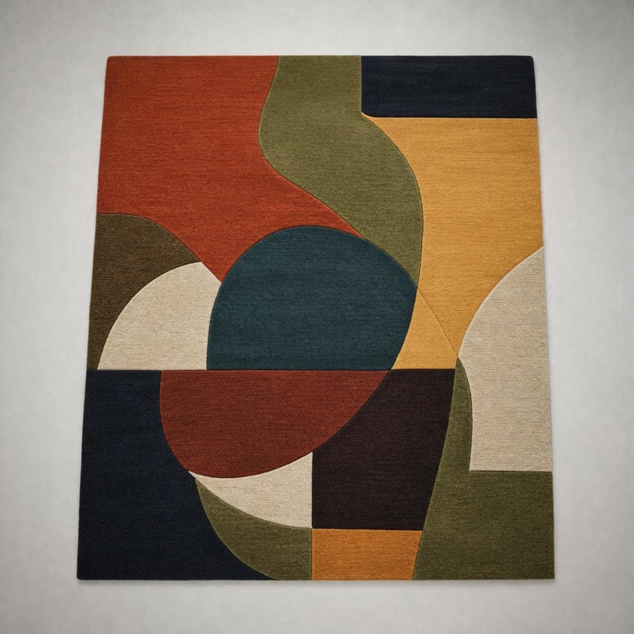 This rug features a striking mid-century modern abstract design with fluid curves and geometric color blocking. The harmonious blend of earthy tones—rust, olive green, mustard, deep navy, and soft cream—creates a balanced yet eye-catching centerpiece. Perfect for modern, Scandinavian, or eclectic interiors, it instantly elevates your décor with artistic flair.
