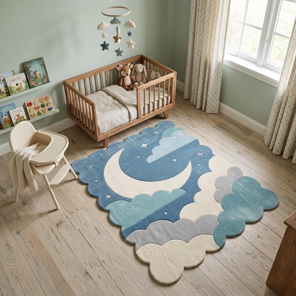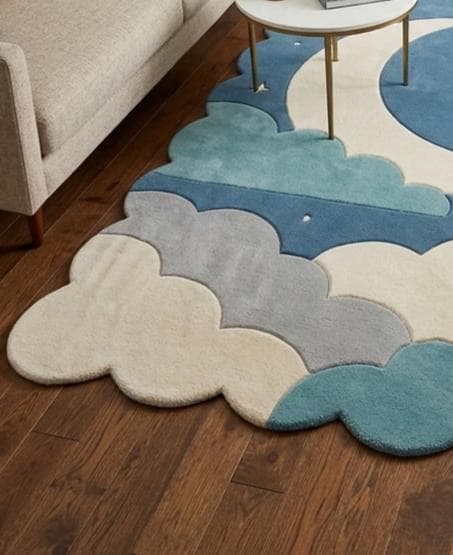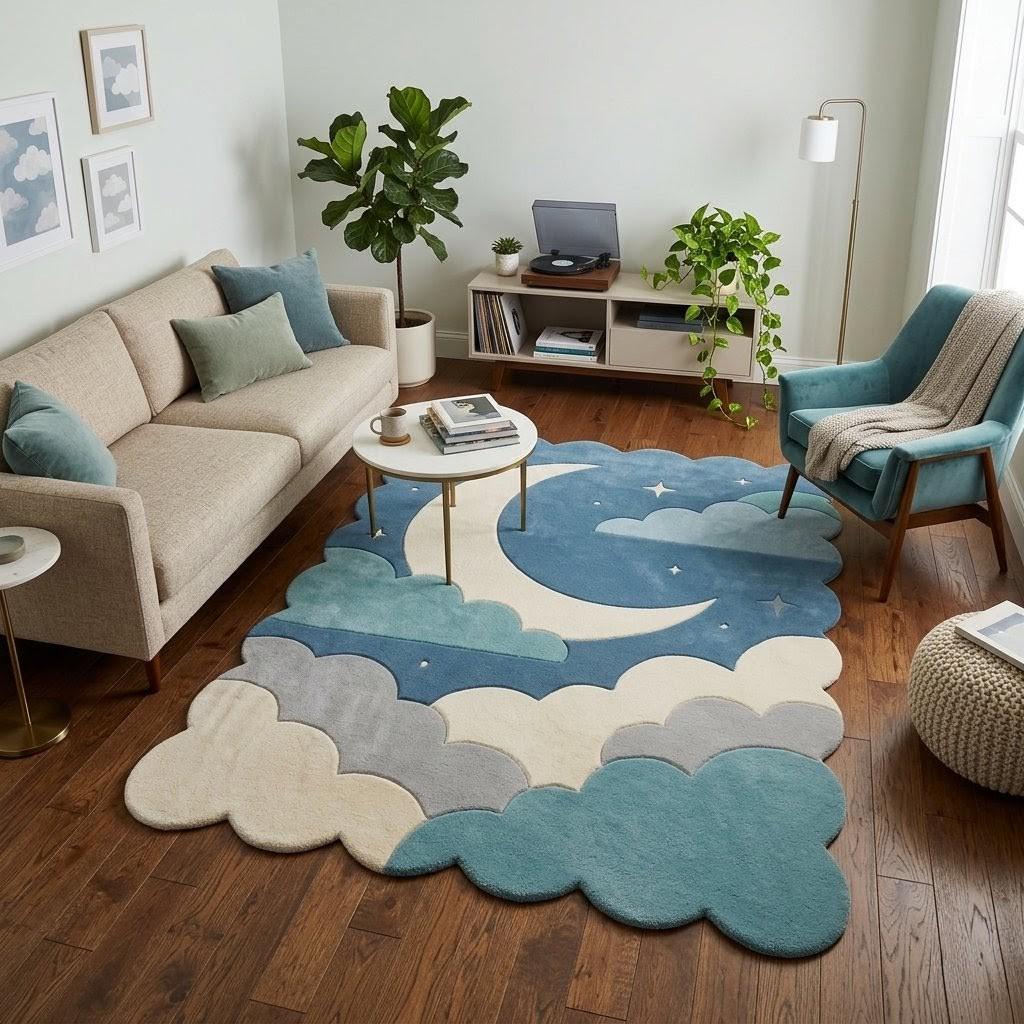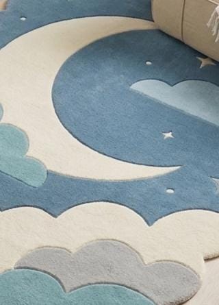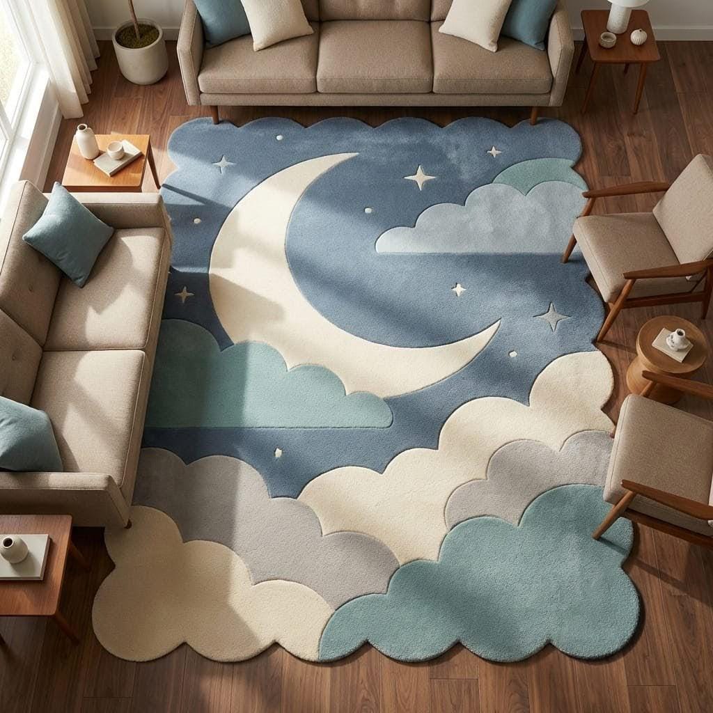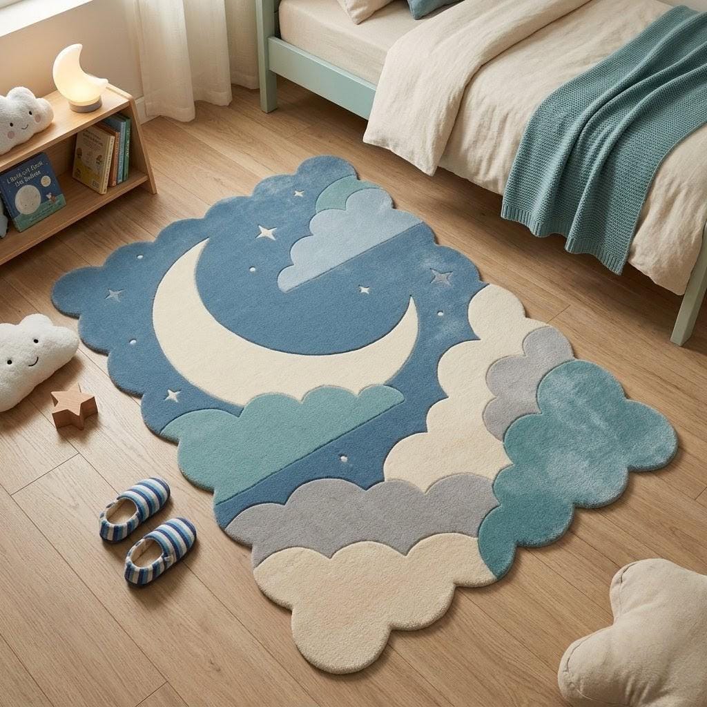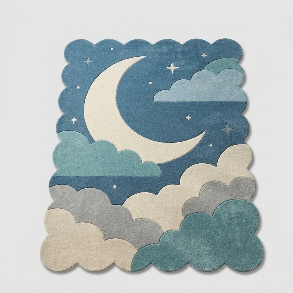 This enchanting rug features a whimsical crescent moon floating among soft, layered clouds against a serene blue sky. Inspired by modern Scandinavian and minimalist design, it blends playful charm with clean, calming aesthetics—perfect for both children's spaces and stylish contemporary interiors.