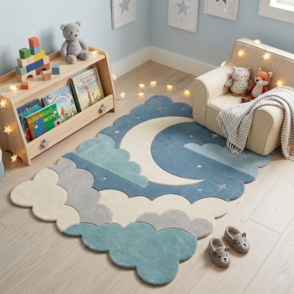 Moon Cloud Rug Blue Nursery Rug Hand Tufted Wool Area Rug Kids Room Decor Modern Scandinavian Soft Carpet Custom Size Available