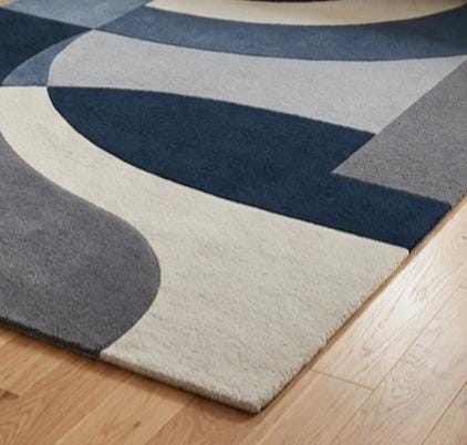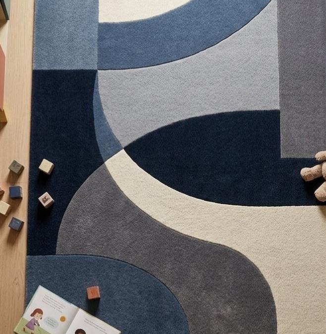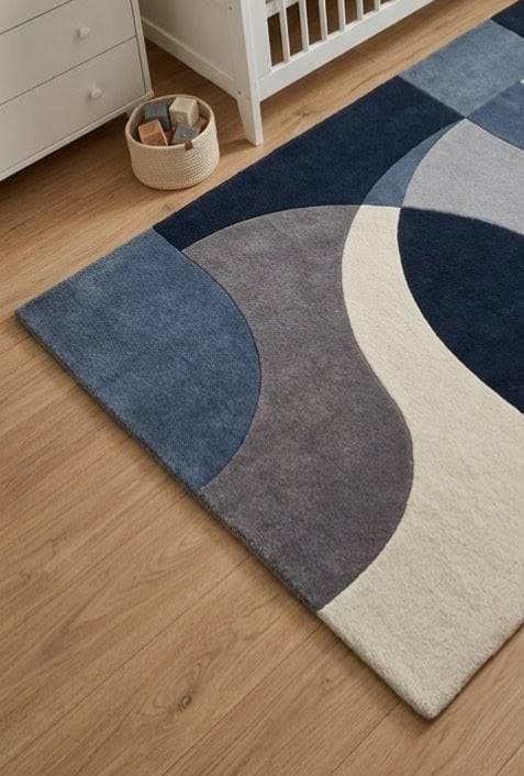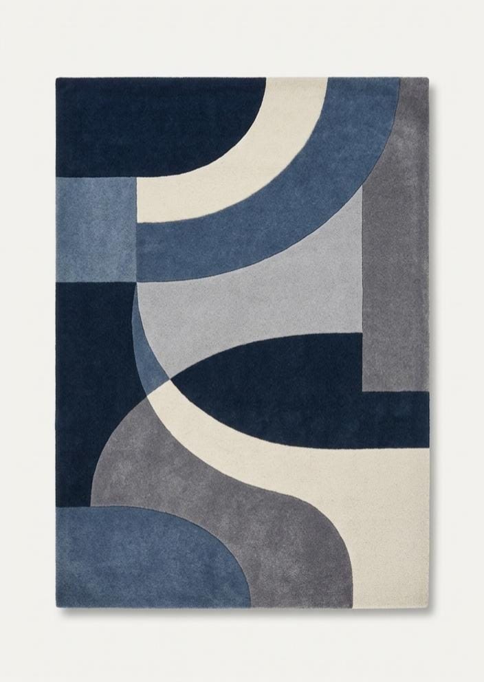 This rug features a striking abstract composition of flowing curves and geometric blocks in deep navy, soft blue, warm beige, and muted grey. Inspired by mid-century modern aesthetics, its clean lines and artistic layout create a perfect balance between bold design and minimalist elegance. It effortlessly anchors a space while adding visual movement and sophistication.