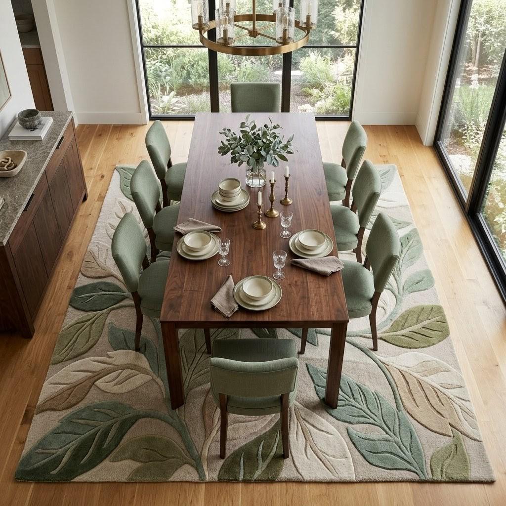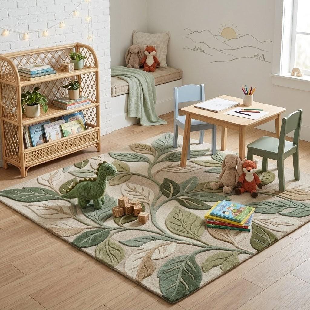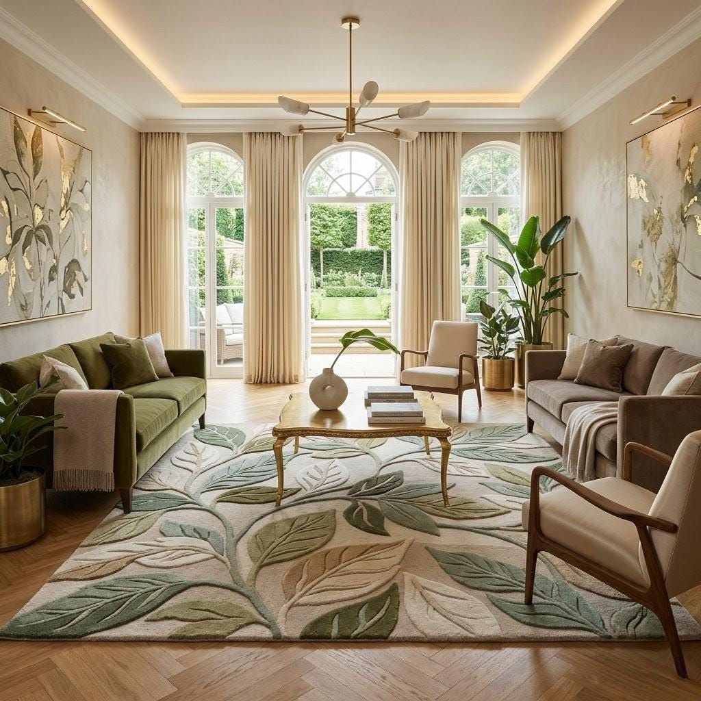Bring the calm of nature indoors with this soft botanical leaf rug in soothing greens and warm neutrals. Its organic design instantly creates a cozy, grounded space that feels both fresh and timeless.