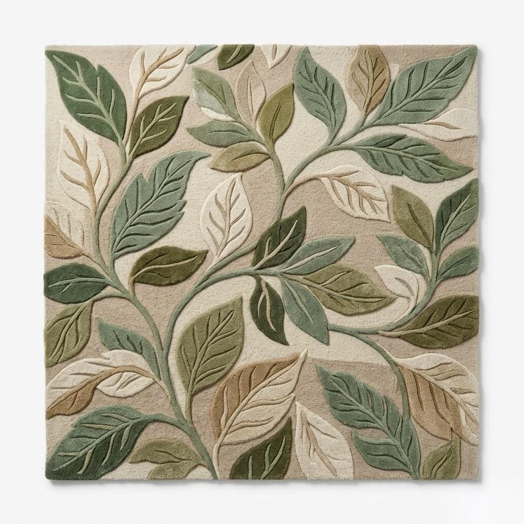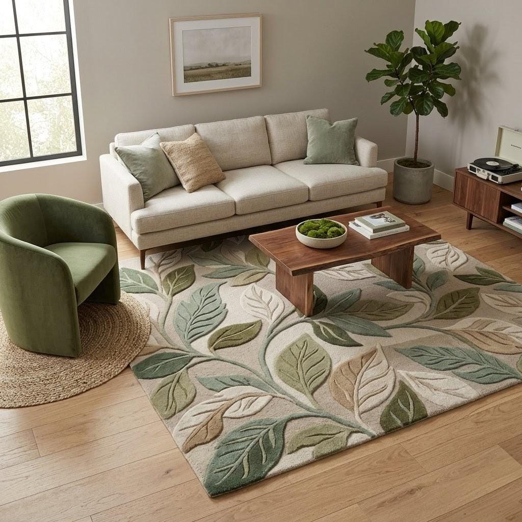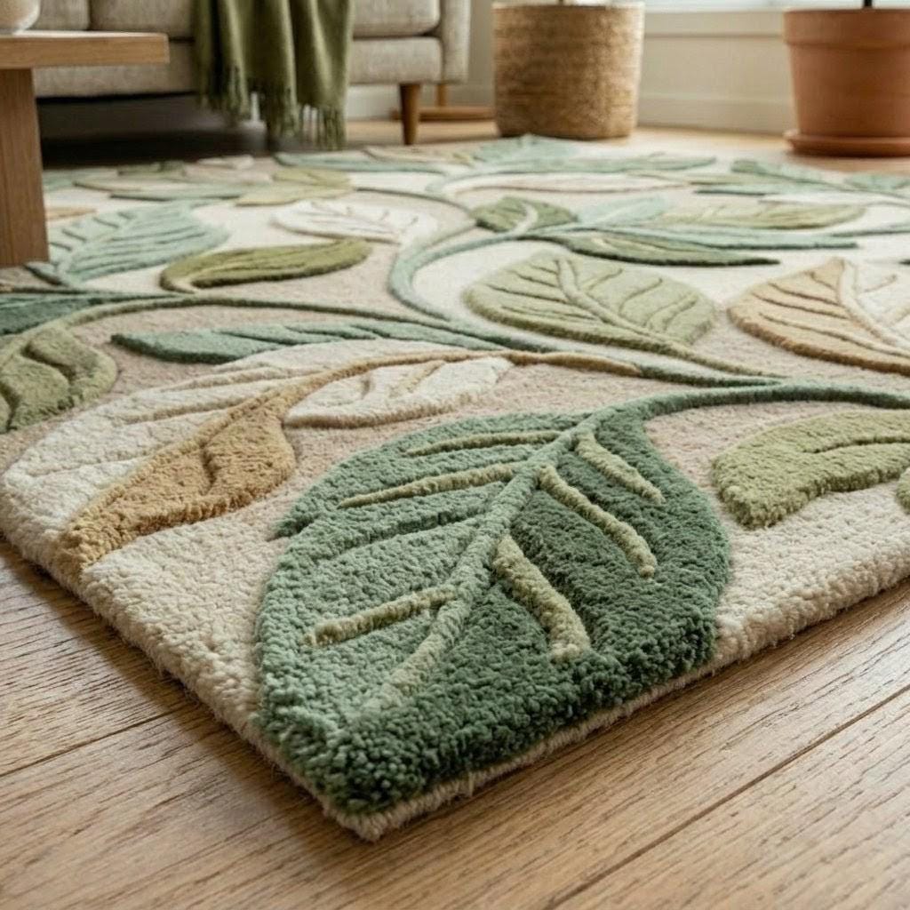 This rug features an elegant botanical leaf pattern with flowing vines in soft sage, olive green, and earthy beige tones. The raised tufted design adds depth and dimension, making it a perfect blend of modern organic, boho, and nature-inspired interiors. Its calming palette pairs beautifully with wood, neutral decor, and minimalist spaces.