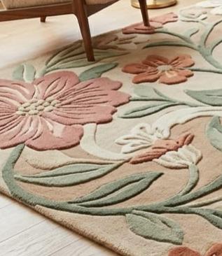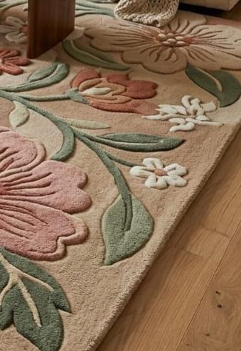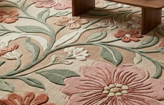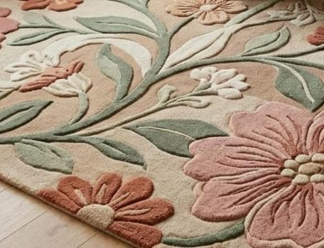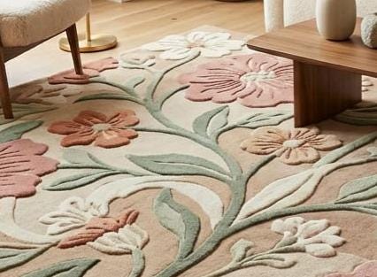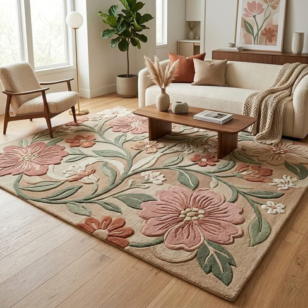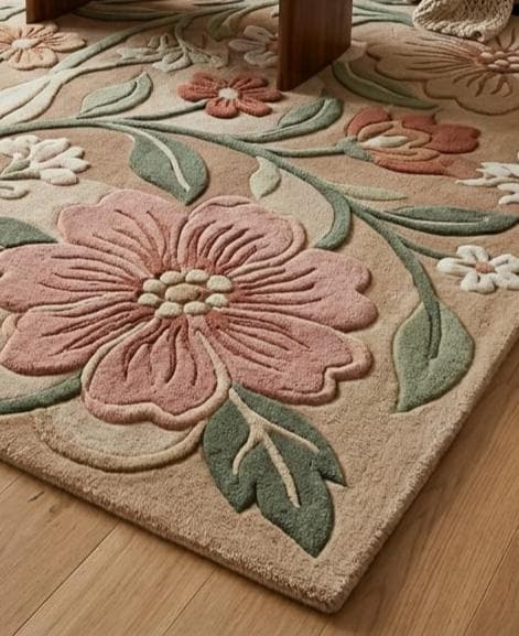 This rug features a graceful botanical floral pattern with oversized blooming flowers and flowing vines. The soft blush pinks, muted terracotta, sage green, and warm beige tones create a harmonious palette that blends effortlessly into modern, boho, Scandinavian, and mid-century interiors. Its raised floral detailing adds depth and an artistic, almost sculptural look that becomes a statement piece without overwhelming the space.