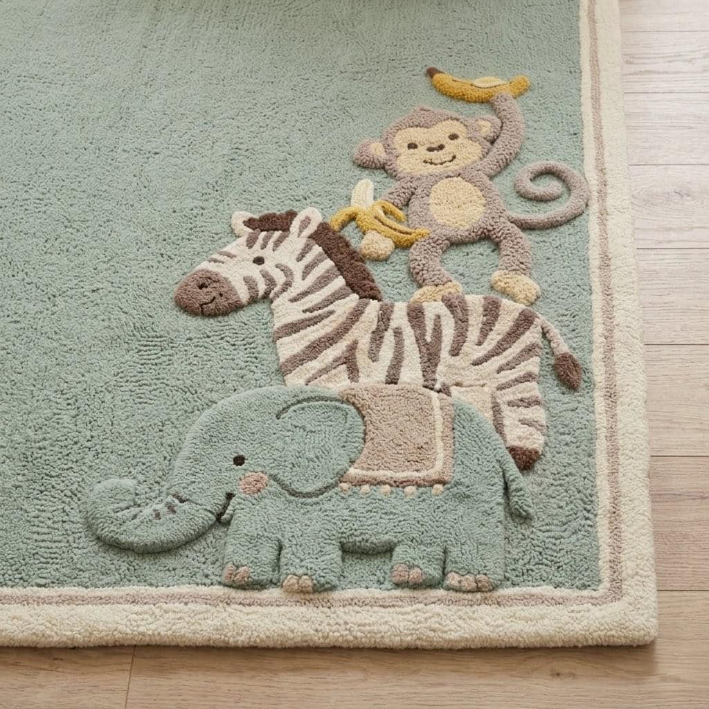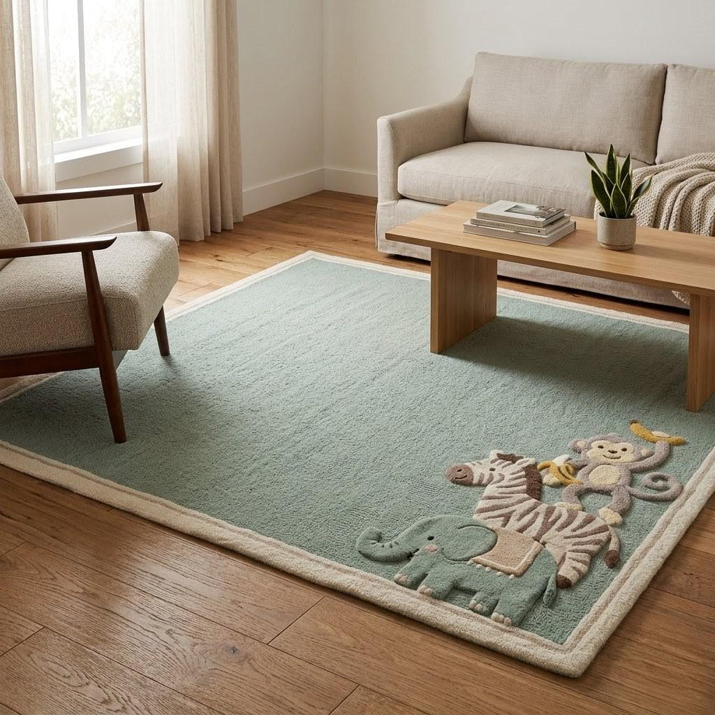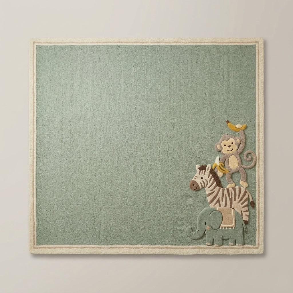 This beautifully crafted rug features a soft sage green base with playful jungle animals—an elephant, zebra, and monkey—tucked into the corner for a subtle yet joyful touch. The minimalist layout keeps the design clean and modern, while the whimsical animal motif adds personality, making it perfect for Scandinavian, modern, or boho-inspired interiors.