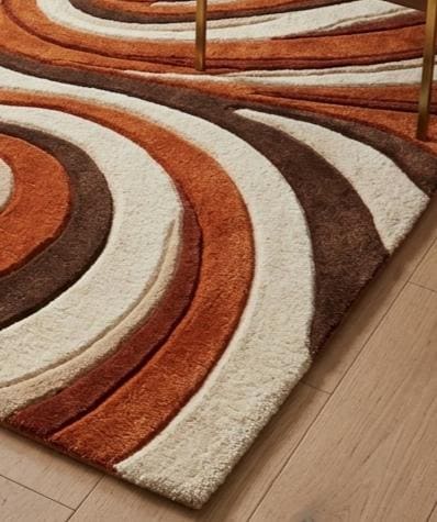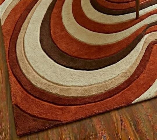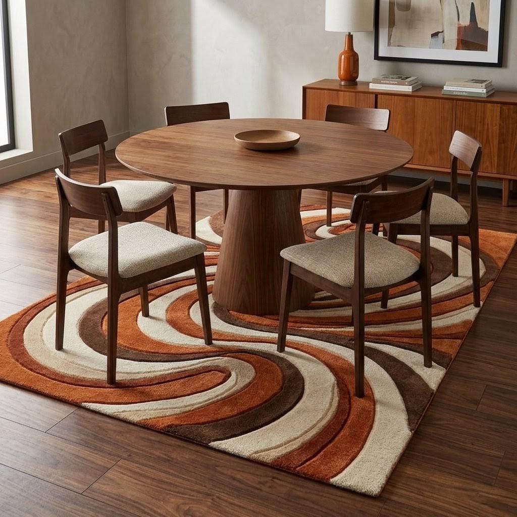 This rug features a bold mid-century modern abstract swirl design, blending retro inspiration with contemporary elegance. The flowing curved lines create a dynamic sense of movement, while the warm palette of rust orange, deep brown, and soft cream adds depth and visual harmony. Perfect for interiors inspired by modern, boho, or vintage aesthetics, this rug becomes an instant focal point.