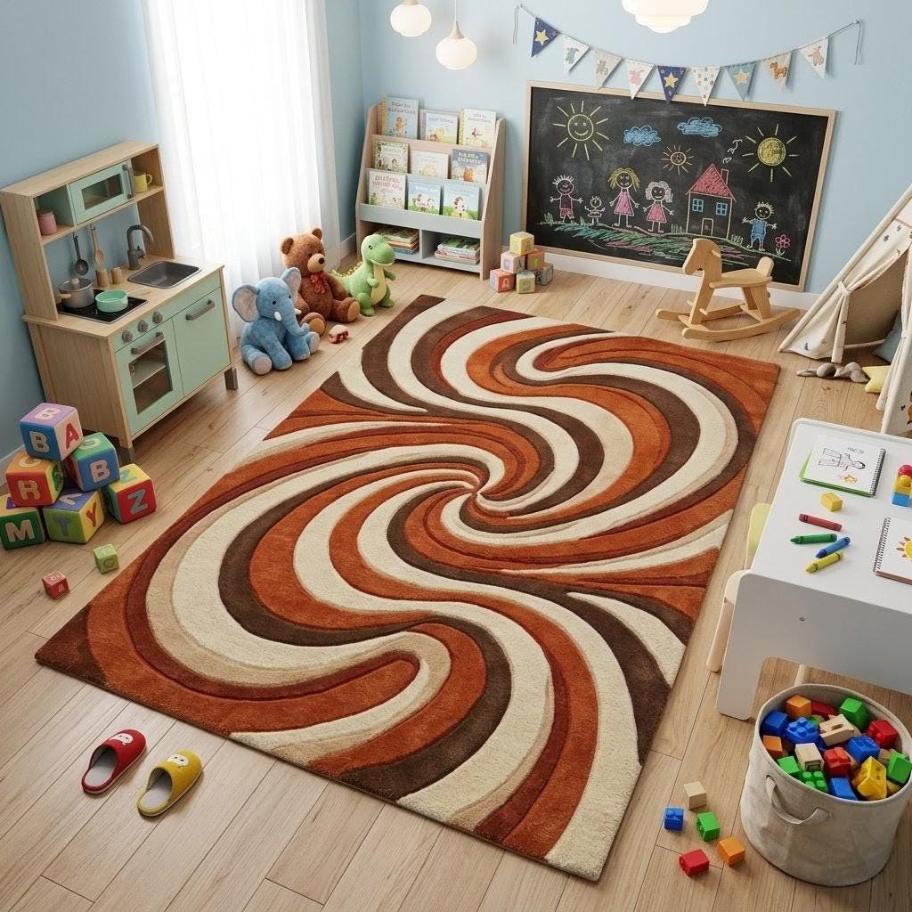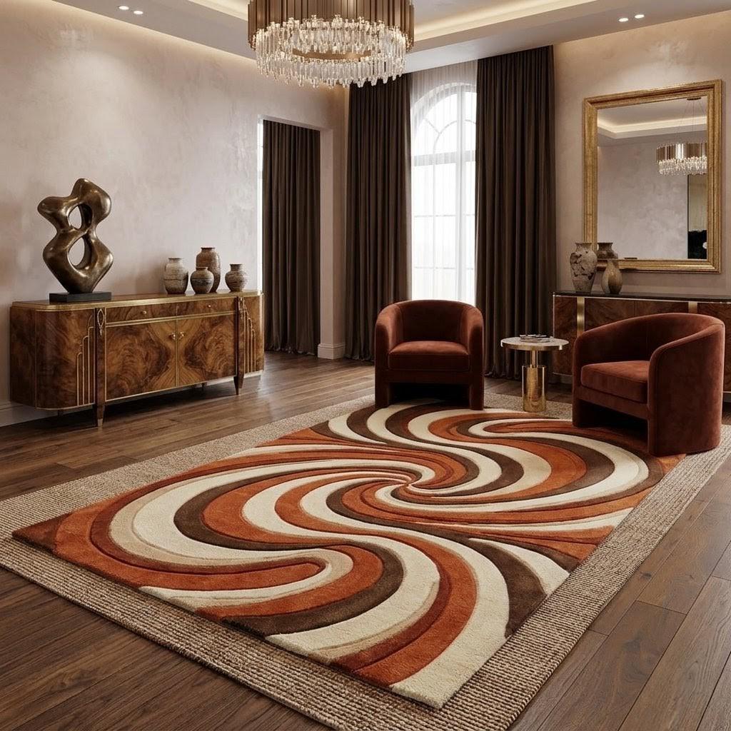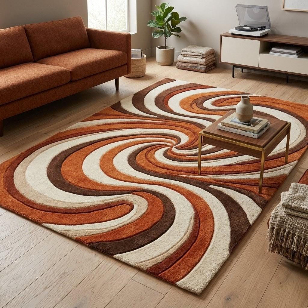Bring warmth, movement, and retro sophistication into your space with this striking swirl-pattern rug. Its rich earthy tones instantly elevate any room into a cozy,