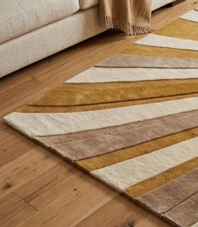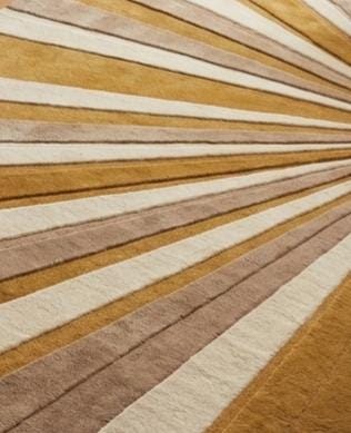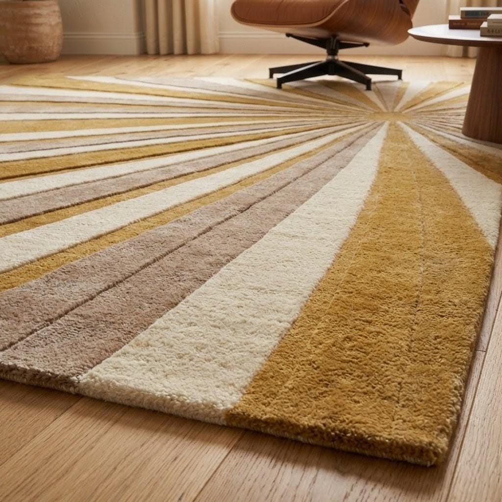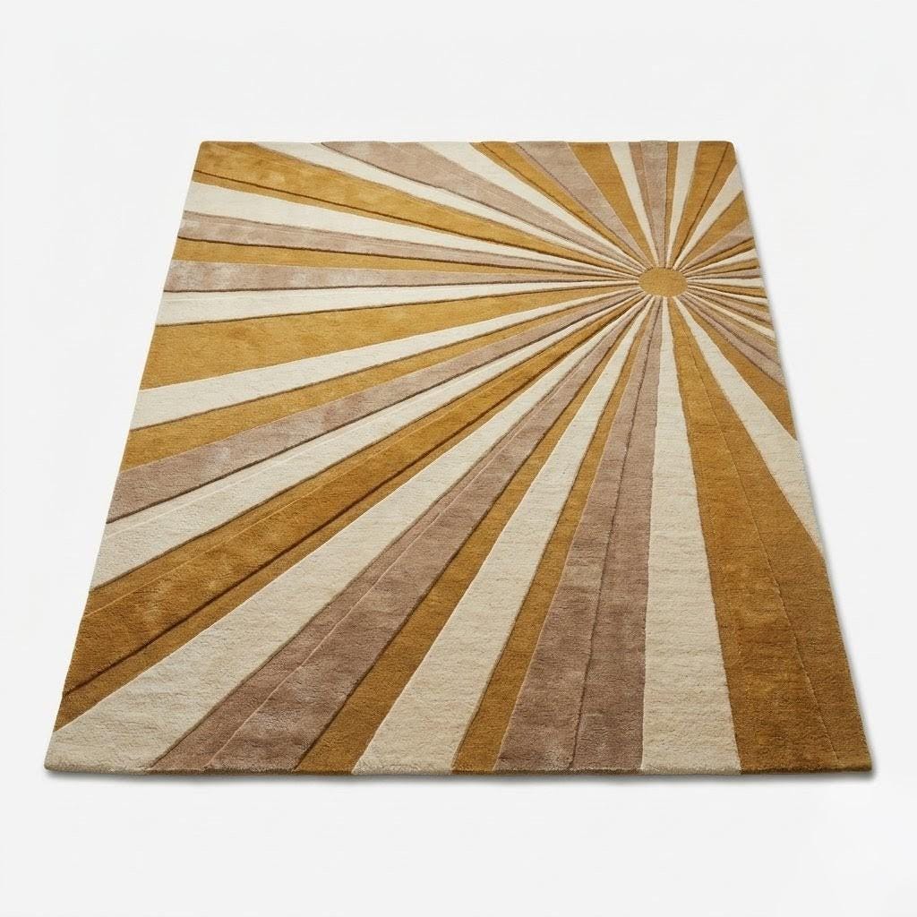 Inspired by vintage sunburst motifs and mid-century modern interiors, this handmade rug features a bold radiating geometric pattern that draws the eye and adds depth to any room. The harmonious palette of mustard gold, ivory, taupe, and warm beige blends beautifully with modern, Scandinavian, boho, and contemporary spaces.