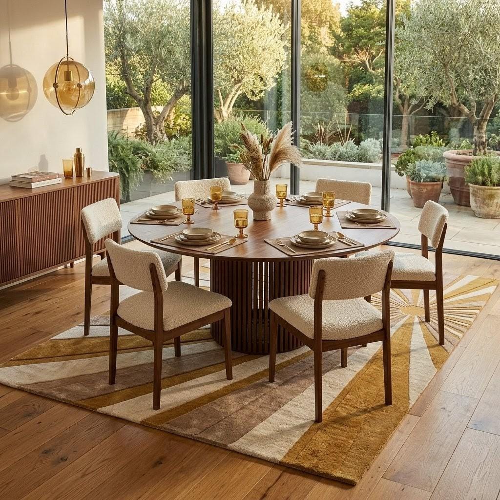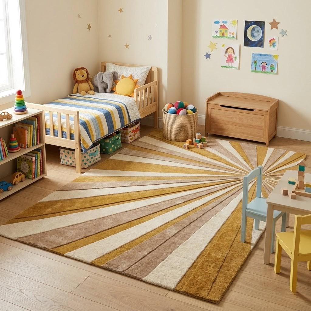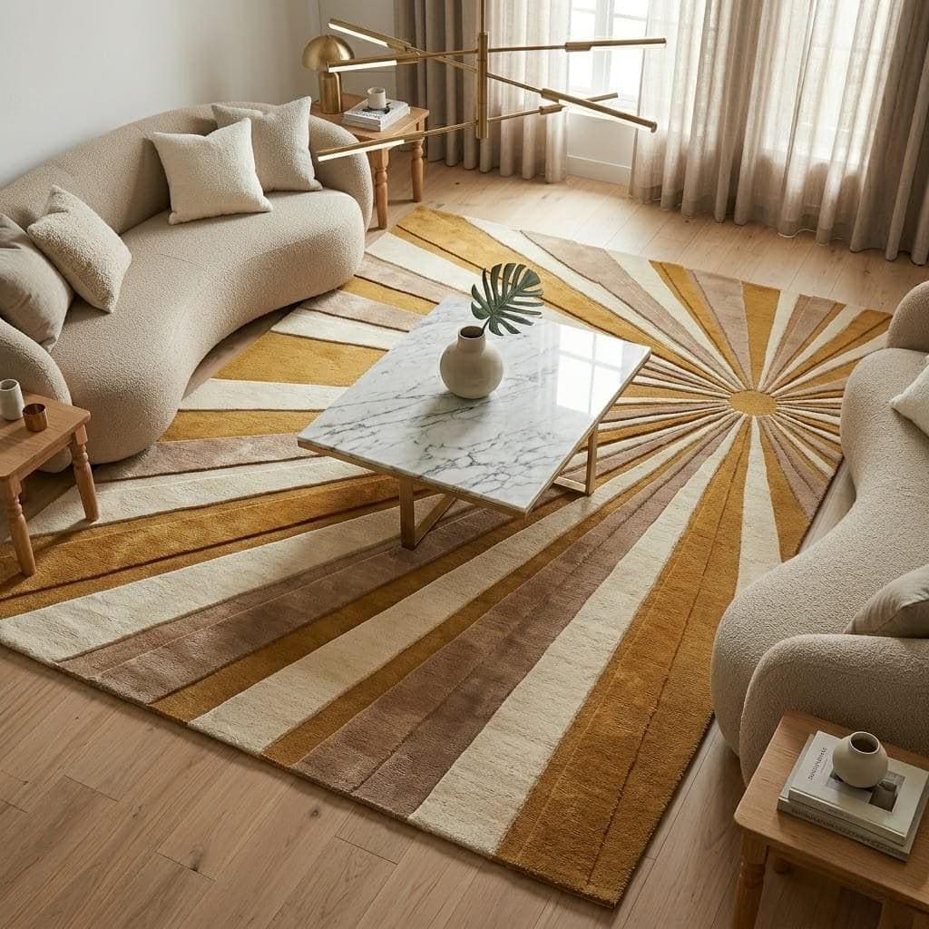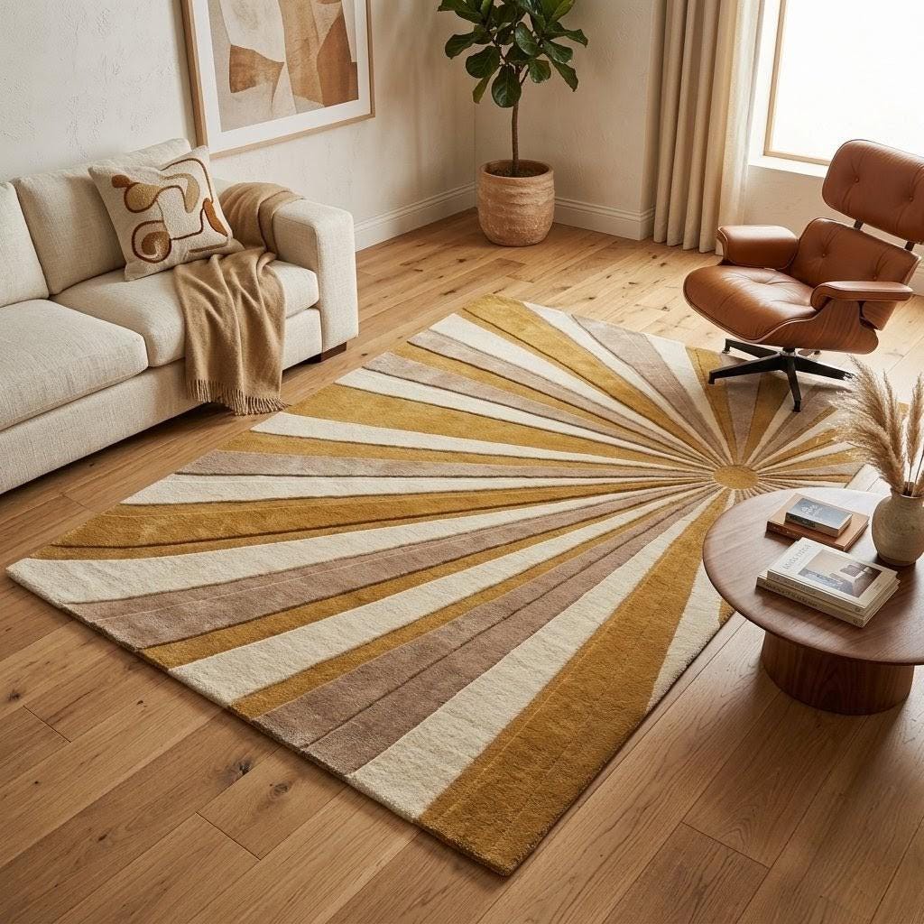 Bring warmth, movement, and artistic energy into your space with this striking sunburst rug inspired by mid-century modern design. Its radiant pattern and earthy golden tones create a statement piece that instantly makes a room feel curated, cozy, and elevated.