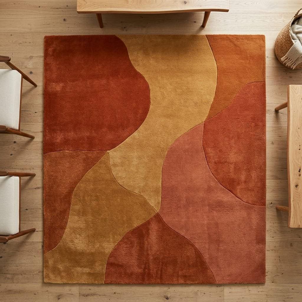 Bring warmth, movement, and artistic character into your home with this hand-tufted abstract wool rug in rich terracotta and golden earth tones. Its sculptural organic design transforms any room into a curated, designer-inspired space that feels both cozy and elevated.