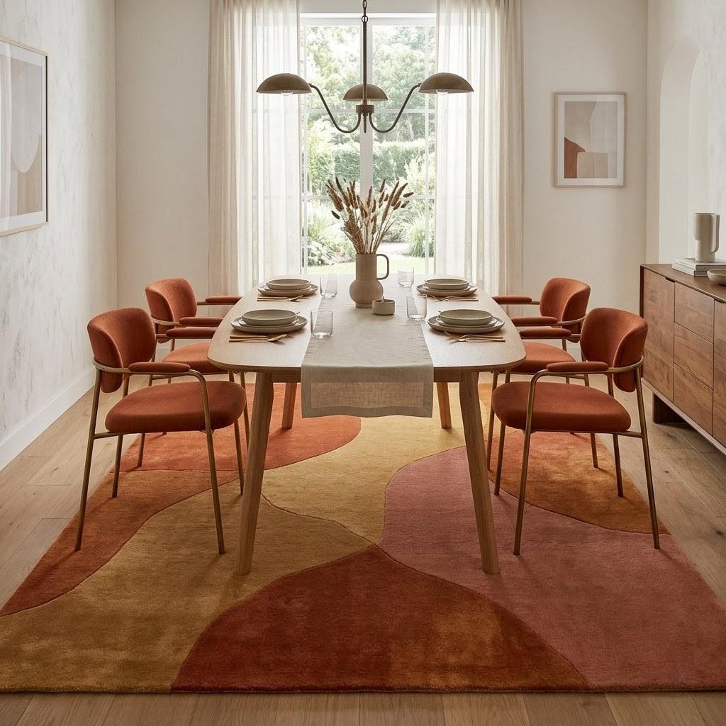 Inspired by organic landscapes and modern abstract art, this rug features flowing asymmetrical forms in terracotta, rust, burnt orange, clay, and warm golden ochre tones.